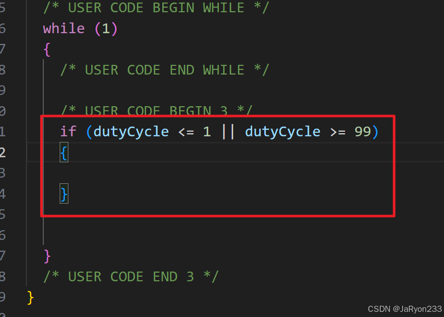 比如我初始占空比为0,此时已经不满足判断条件,因此会变成-1,此时占空比就会变成负数,显然不符合逻辑,所以自然可以想到让step初始为-1。但是这时候其实仍不能解决问题,因为占空比为0时,进入判断将step变成1后会0+1=1,此时再次判断结果又进去将step变成-1了,此时占空比又会-1变成0,然后就这样循环卡在0和1里面,这显然不行。所以最好的办法就是让占空比初始值处于1~99之间,这样就能解决该问题了。所以直接将dutyCycle初始值改为1即可。
