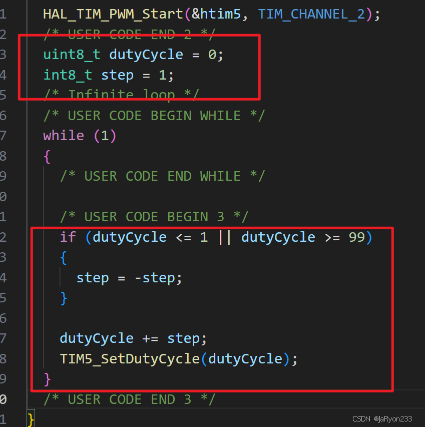 HAL_TIM_PWM_Start(&htim5, TIM_CHANNEL_2);/* USER CODE END 2 */uint8_t dutyCycle = 0;int8_t step = 1;/* Infinite loop *//* USER CODE BEGIN WHILE */while (1){/* USER CODE END WHILE *//* USER CODE BEGIN 3 */if (dutyCycle <= 1 || dutyCycle >= 99){step = -step;}dutyCycle += step;TIM5_SetDutyCycle(dutyCycle);}HAL_Delay(10);/* USER CODE END 3 */