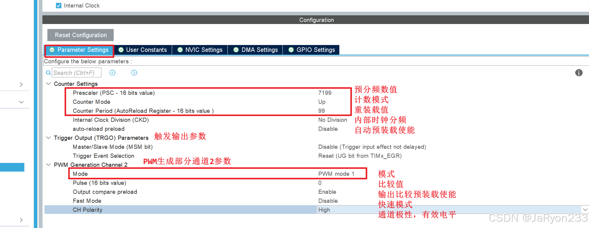 Counter Period(AutoReload Register),即对应自动重装载寄存器值ARR,我们配置为99,即一轮计数100次;