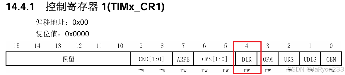 首先是控制寄存器1,由于通用定时器技术模式多样,因此我们需要专门配置一下计数方向,所以要在CR1中对DIR位进行配置,如下图所示
