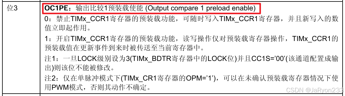 Output Compare Preload,即输出比较预装载使能,前面说过捕获/比较寄存器也存在预装载功能,也就是有预装载寄存器和影子寄存器,这其实对应寄存器CCMR中的OCEP位。当然开不开都可以,HAL库是默认开的,所以不影响,即Enable/Disable都可;