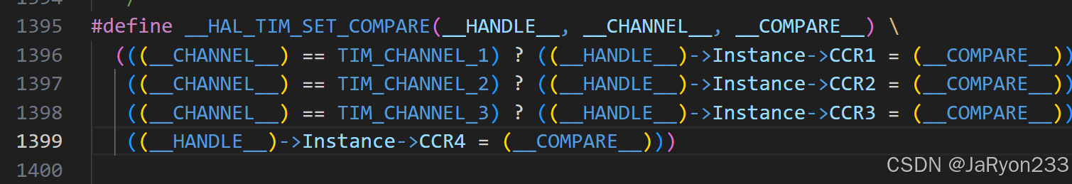 可以发现,这个函数还有点特殊,是个宏定义函数,不过进去一看如上图所示,其中有三个参数,看名字还是容易理解是什么的,__HANDLE__就是定时器的那个结构体指针、__CHANNEL__就是使用的通道、__COMPARE__就是设置的比较值。