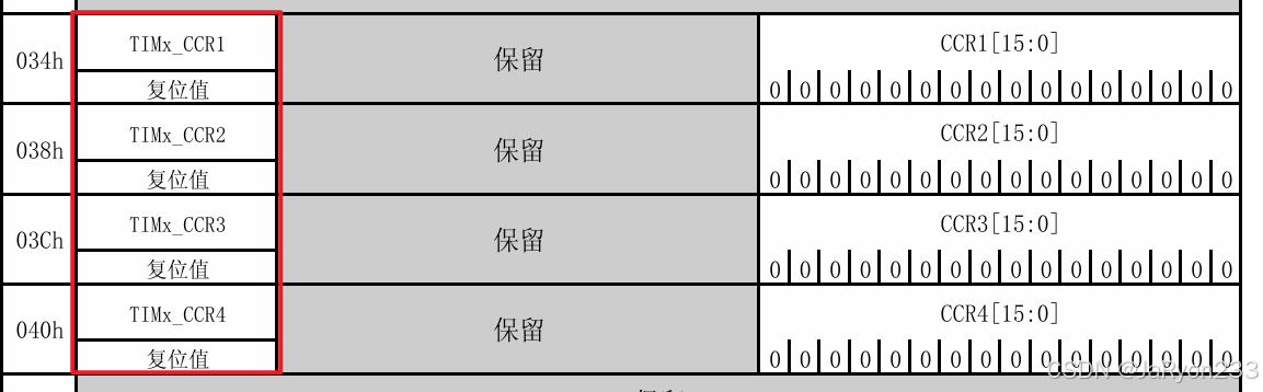 由图可知,这只是通道1对应的捕获/比较寄存器,也就是说一个通道对应一个,因此一个有四个CCR寄存器,从通用定时器的寄存器映射图可以清楚看见,如下图所示