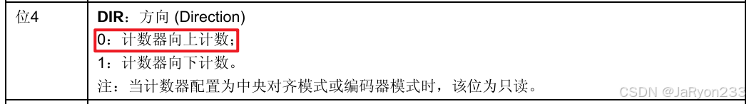 我们一般就使用默认的向上计数模式就行,因此DIR位要配置为0即可,参考代码如下。