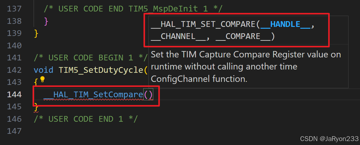 接着直接在设置占空比函数中调用HAL库的函数设置比较值就行。当然,目前还不知道HAL库用啥函数获取的,所以得利用Vscode的代码联想功能区试一下,这里我就直接列出来吧。