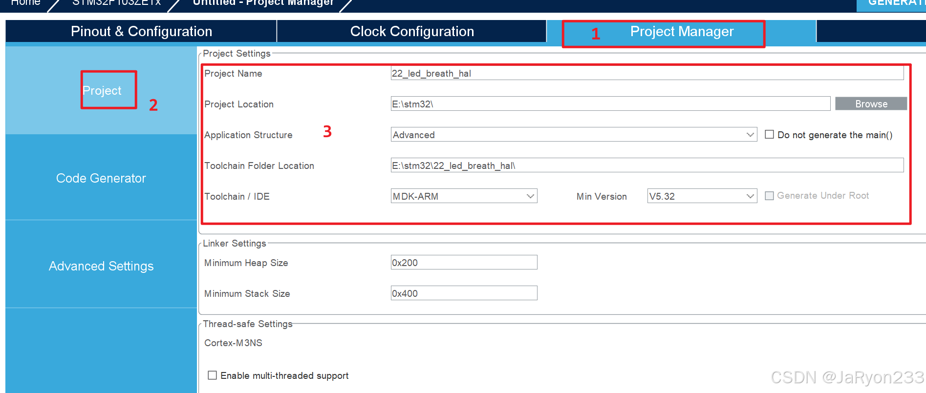最后,我们配置一下工程管理,点击进入【Project Manager】,在【Project】中配置一下,如下图所示。