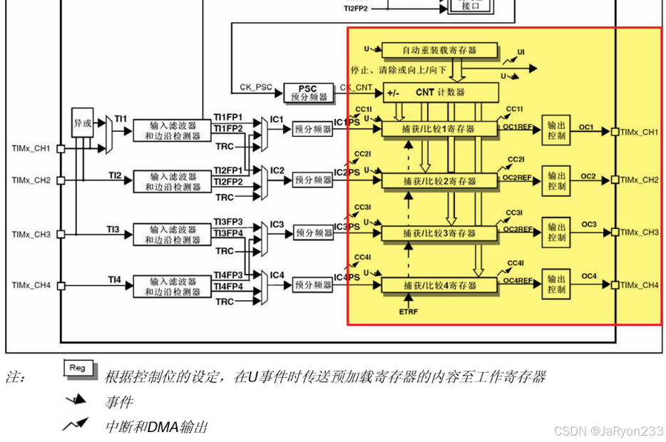 首先是计数部分。大家应该很熟悉了,就是自动重装载寄存器和CNT计数器构成,用来进行定时器的计数的;