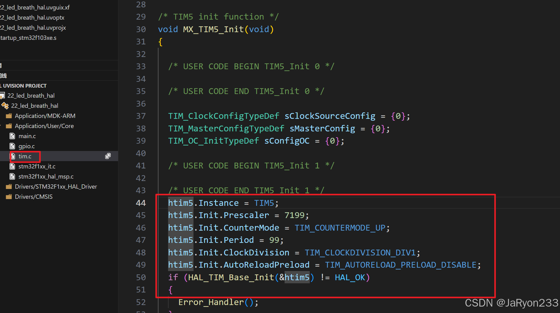 首先,我们可以看看tim.c中的配置,检查一下进行图形化配置时有没有设置错,若有问题可以直接在代码中修改,如下图所示。