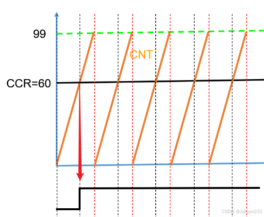 可以看出,一开始为低电平,随后当计数值等于比较值时输出电平被翻转为高电平,随后计数器溢出,重新从0开始计数,此时仍为高电平,随后再次出现计数值等于比较值时输出电平再次翻转变成低电平,以此循环。可以发现,此模式下输出的是一个很标准的方波,其中高电平和低电平宽度或者是持续时间就是我们计数器一轮计数的时间,因此此时输出的方波频率为计数器溢出频率的一半,占空比为50%。这种看起来有些像PWM了,但实际并不是,我们所设置的CCR更像相位的变化。