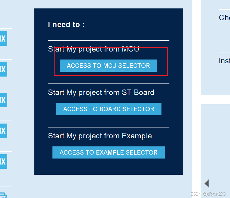 首先打开STM32CubeMX,点击【ACCESS TO MCU SELECTOR】进行芯片选择。
