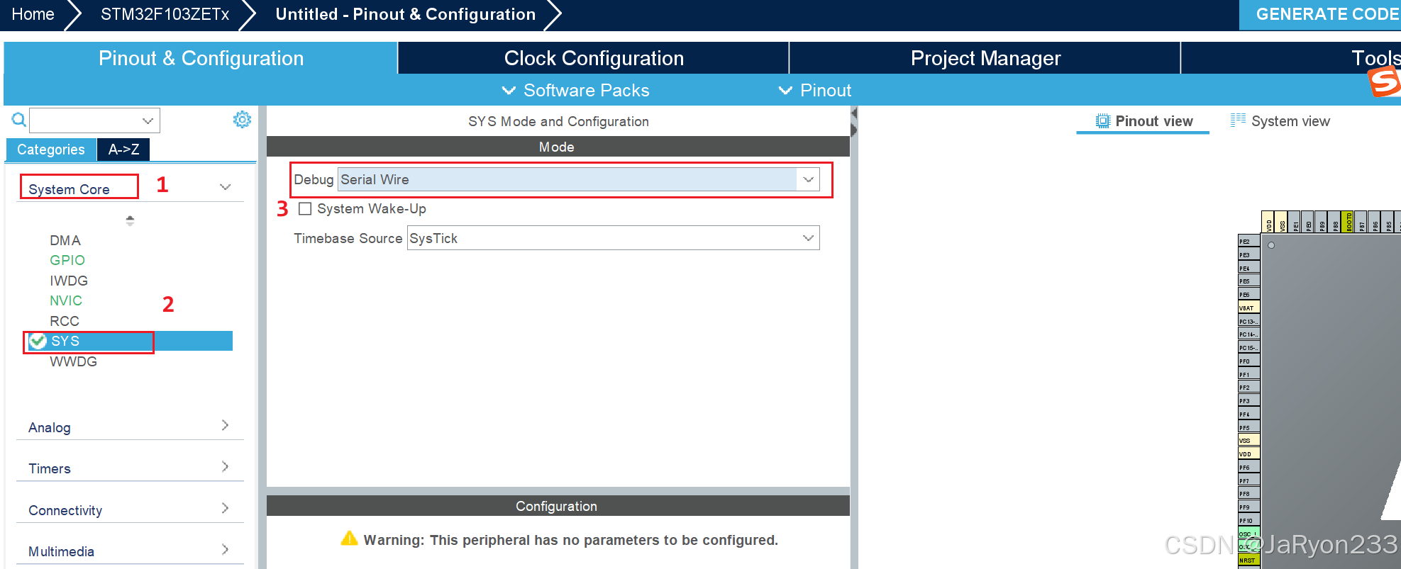 工程创建好后,会进入该工程的图形化配置界面。然后先进行系统配置,单击【System Core】,选择【SYS】,将其中的调试器【Debug】选择【Serial Wire】串行单线调试模式,也就是使用STlink使用的调试模式,时基源默认系统定时器,如下图所示。