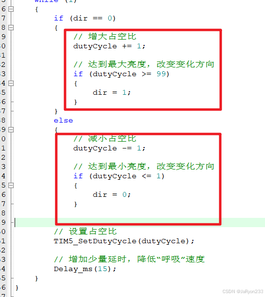 {// 1. 初始化TIM5_Init();// 2. 开启定时器TIM5_Start();// 3. 初始化占空比及变化方向uint8_t dutyCycle = 0;uint8_t dir = 0; // 0-增 1-减while (1){if (dir == 0){// 增大占空比dutyCycle += 1;// 达到最小亮度,改变变化方向if (dutyCycle >= 99){dir = 1;}}else{// 减小占空比dutyCycle -= 1;// 达到最大亮度,改变变化方向if (dutyCycle <= 1){dir = 0;}}// 设置占空比TIM5_SetDutyCycle(dutyCycle);// 增加少量延时,降低“呼吸”速度Delay_ms(15);}