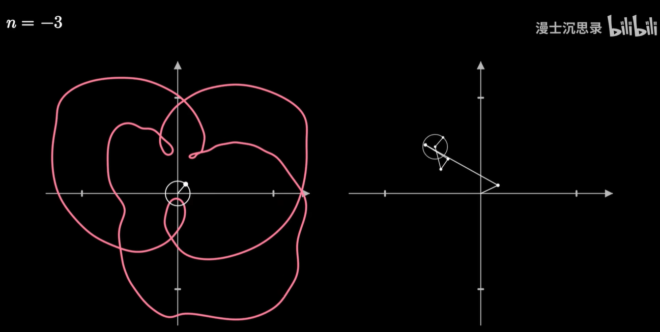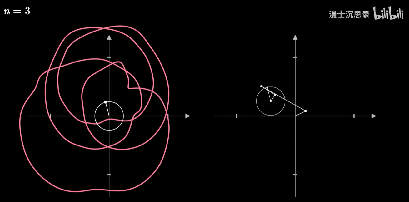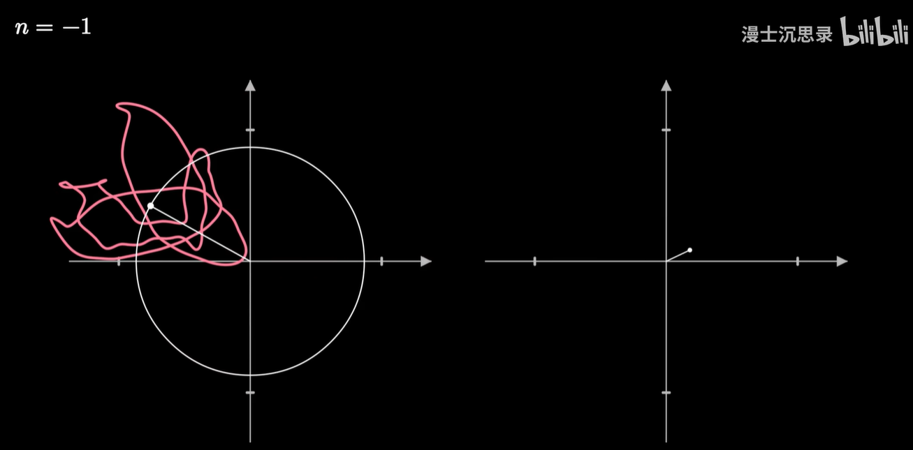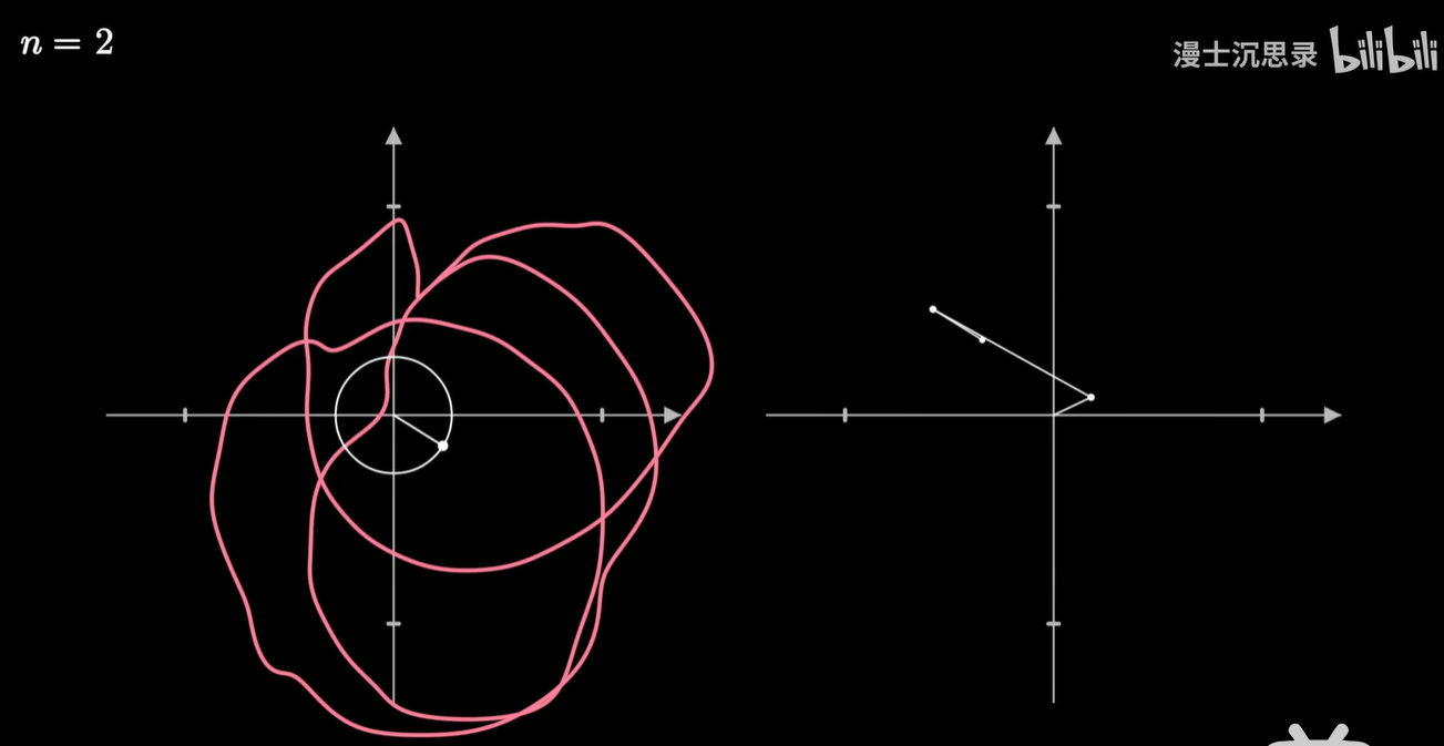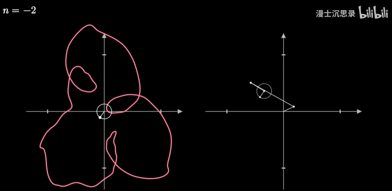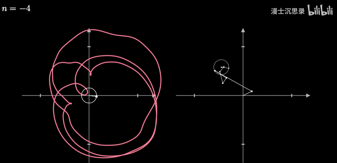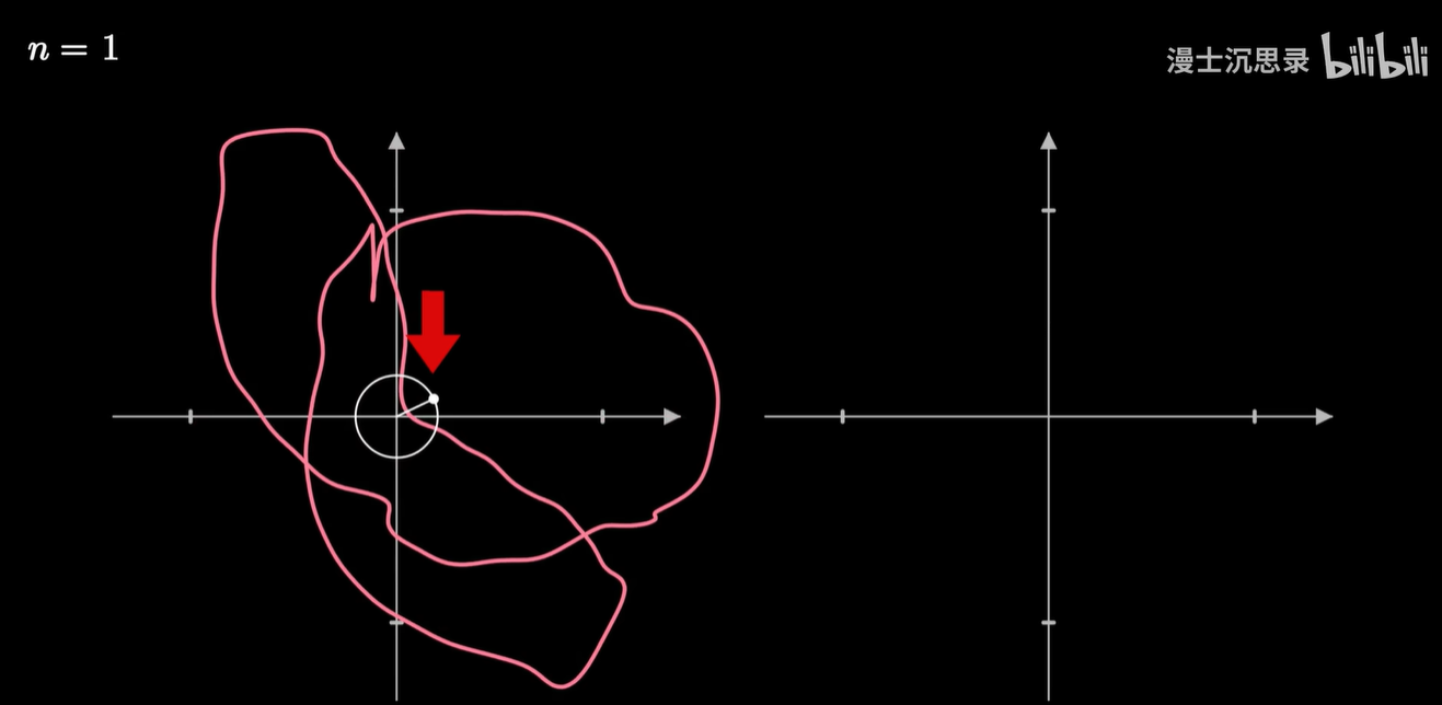 它的几何含义是:将原来的图像反向的缠绕 n 圈,那么此时整个曲线会有一个质心,这个质心所在的向量,就刚好对应于这个频率的圆周旋转所需要的半径和初始相位。