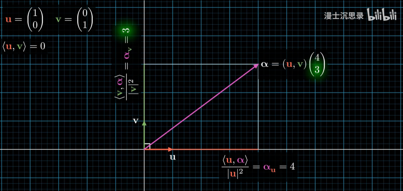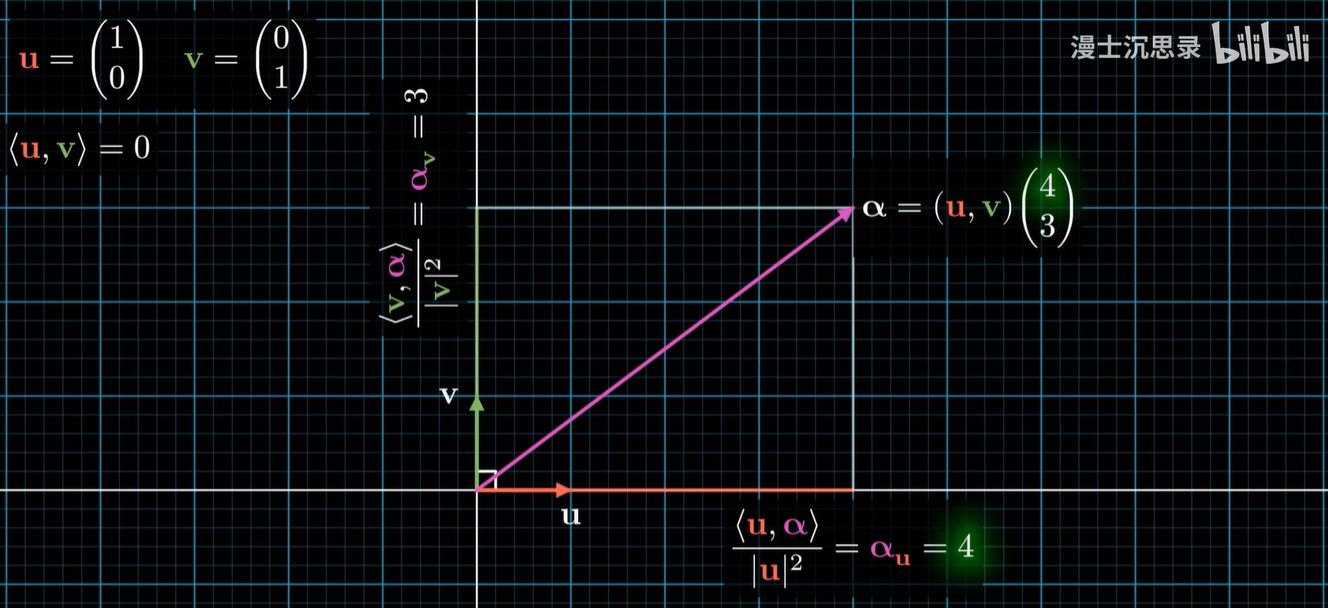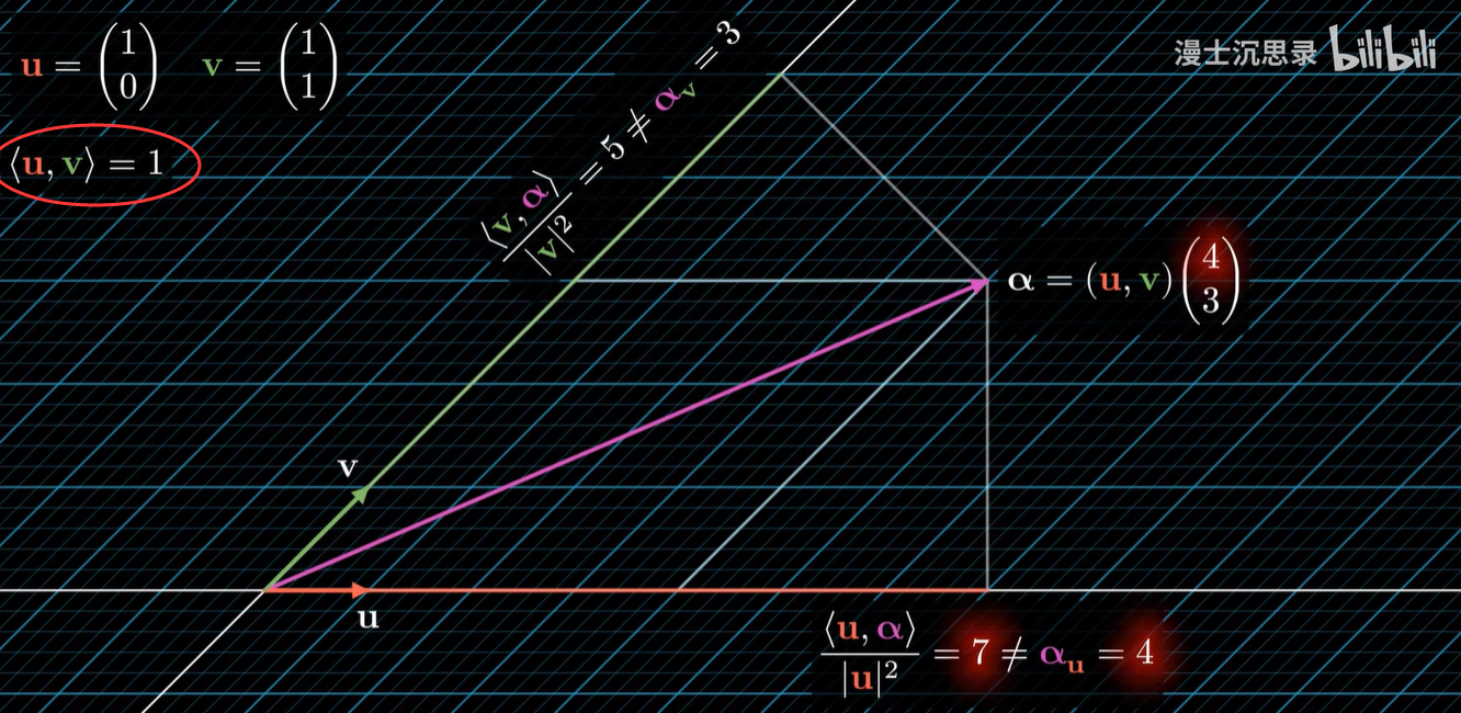 只有单位正交的基底才能够通过内积的方式直接反向还原出它线性组合的坐标来。