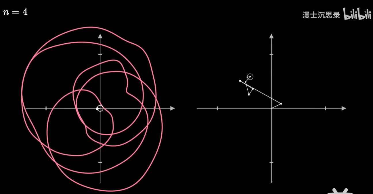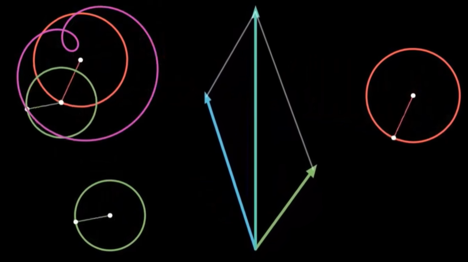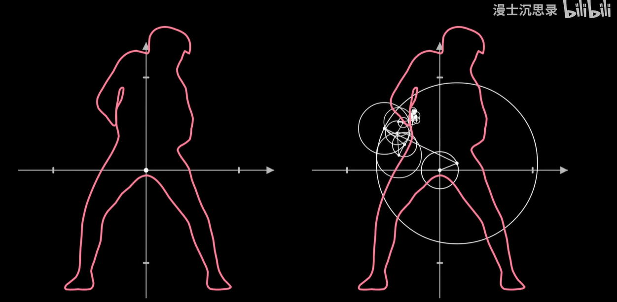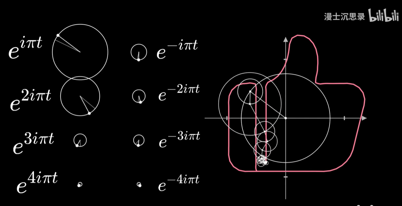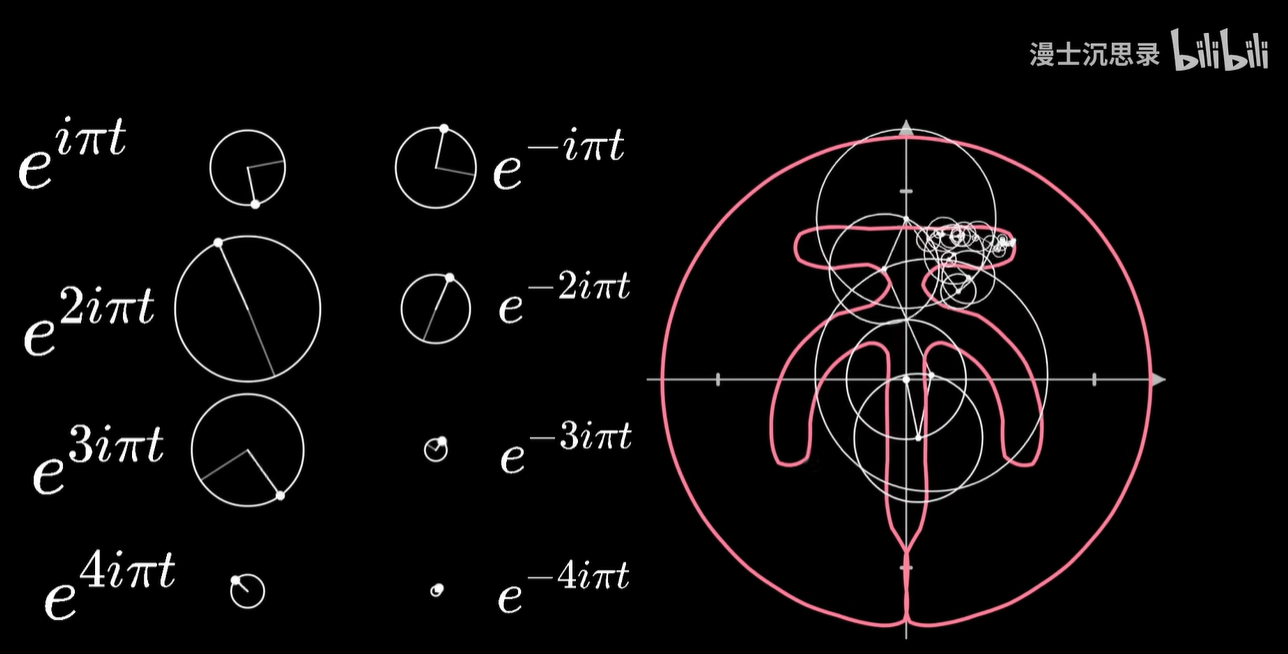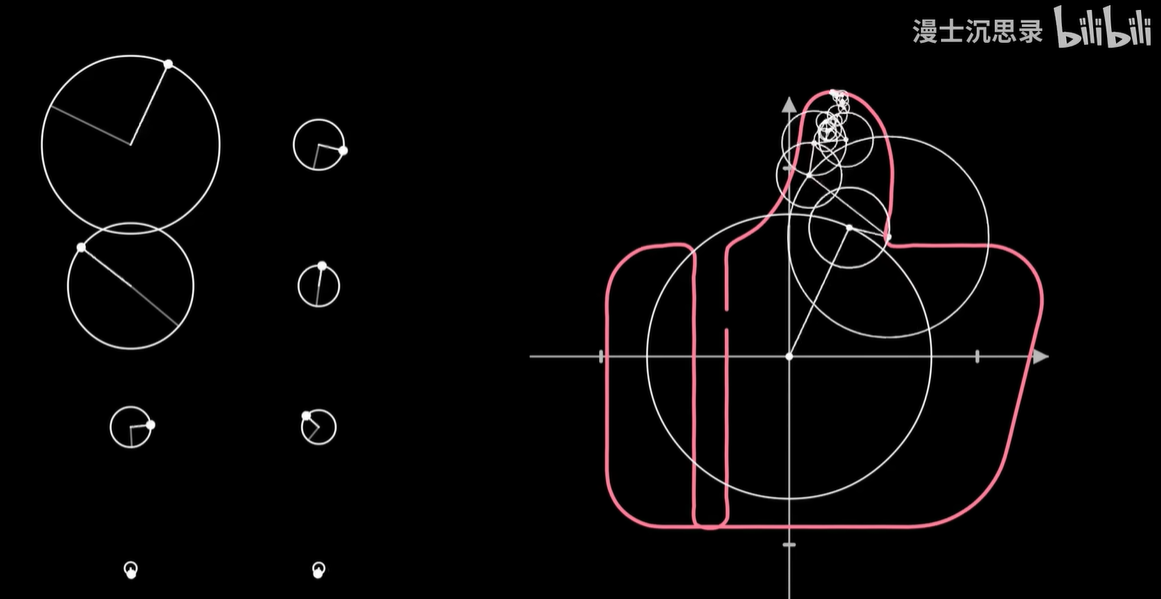 我们把画笔的运动当成一个向量,然后同样用一些基底向量运动的组合来搭建这个运动,而这些基底的运动就是以不同的速度和半径匀速画圈。