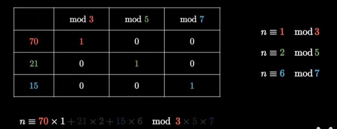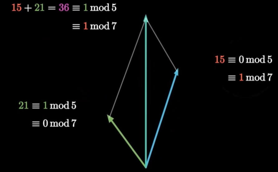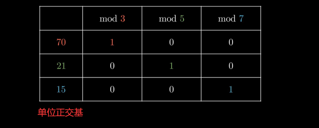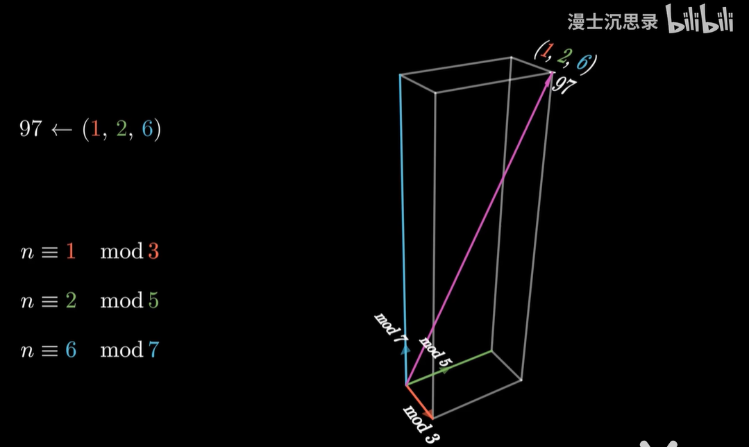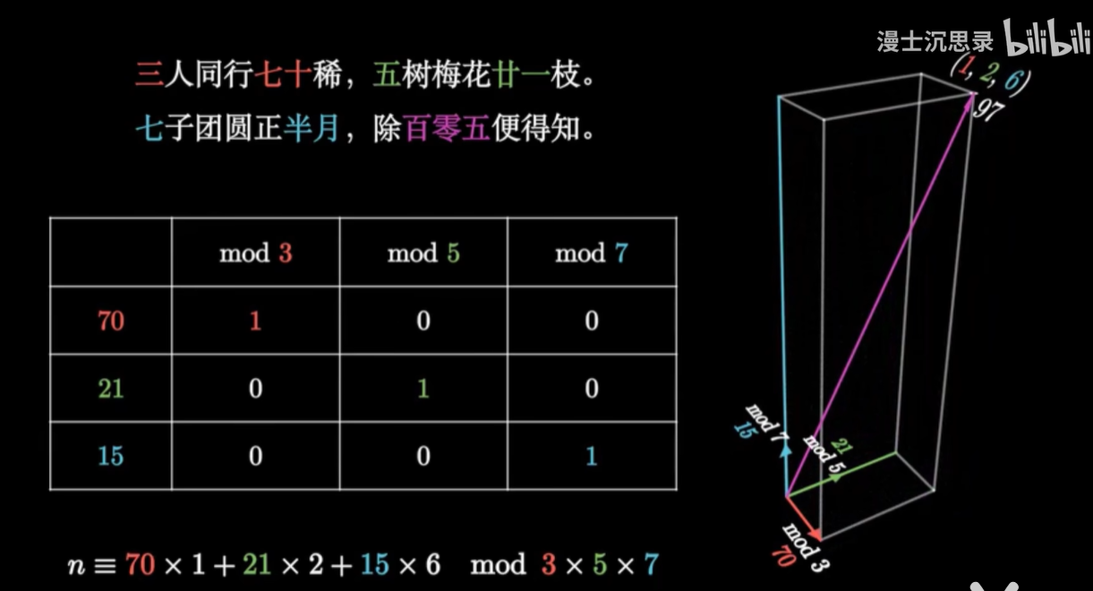 所以韩信点兵的本质,就是把整数当成向量,把它分别除以三、五、七之后,得到三个坐标,来进行坐标轴的分解。