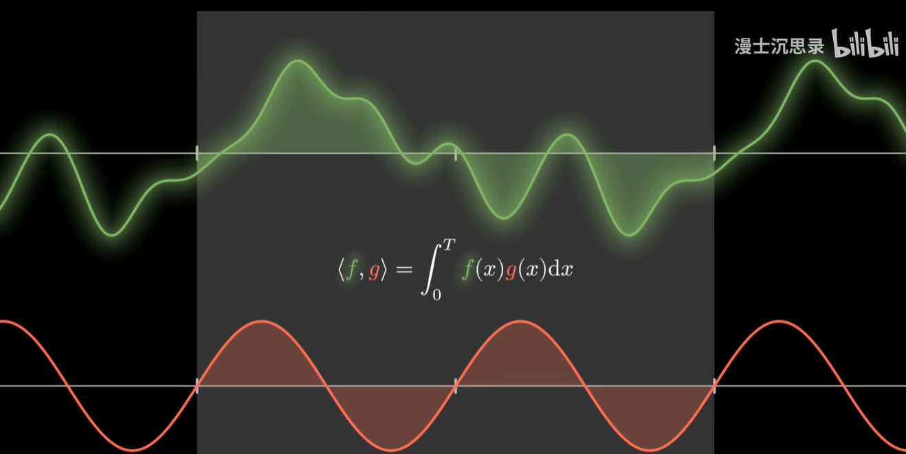 如果我们分的无限多,这本质上就相当于把两个函数相乘之后,在一段周期内把所有函数值加起来,唉,这有一个非常自然的表示,那就是——积分。