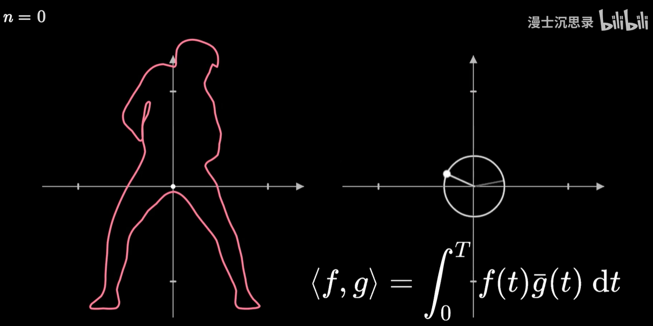 那当然还是前面说过的内积了,这里的向量是在复平面上的运动,所以如果我们想要知道原来复杂的运动过程,这个向量和每秒钟转 n 圈的圆周运动两个向量的内积,那么我们可以根据复数相乘的几何意义,也做这个乘积的积分。
