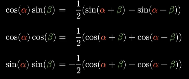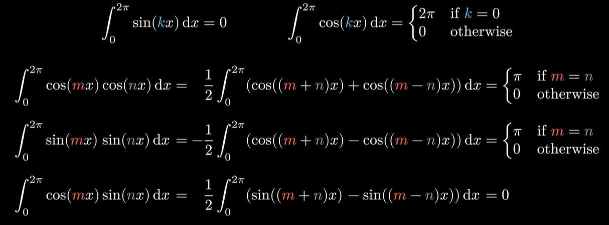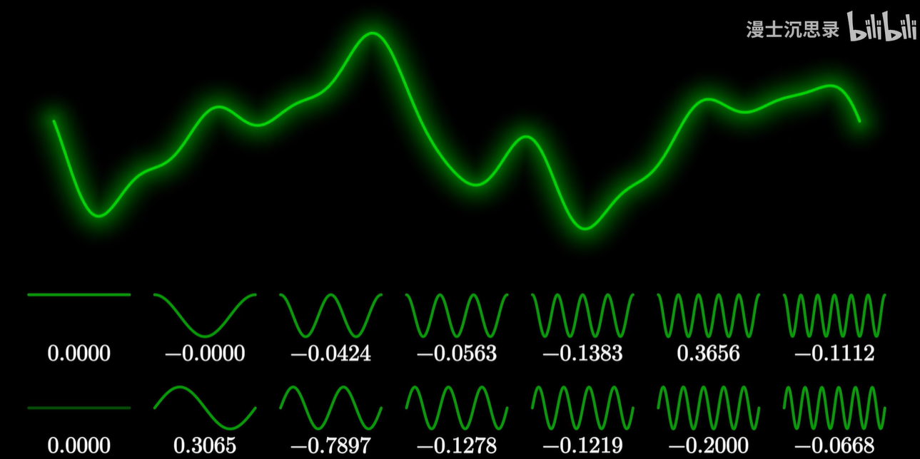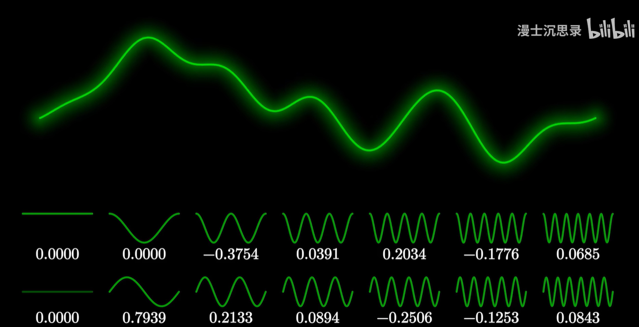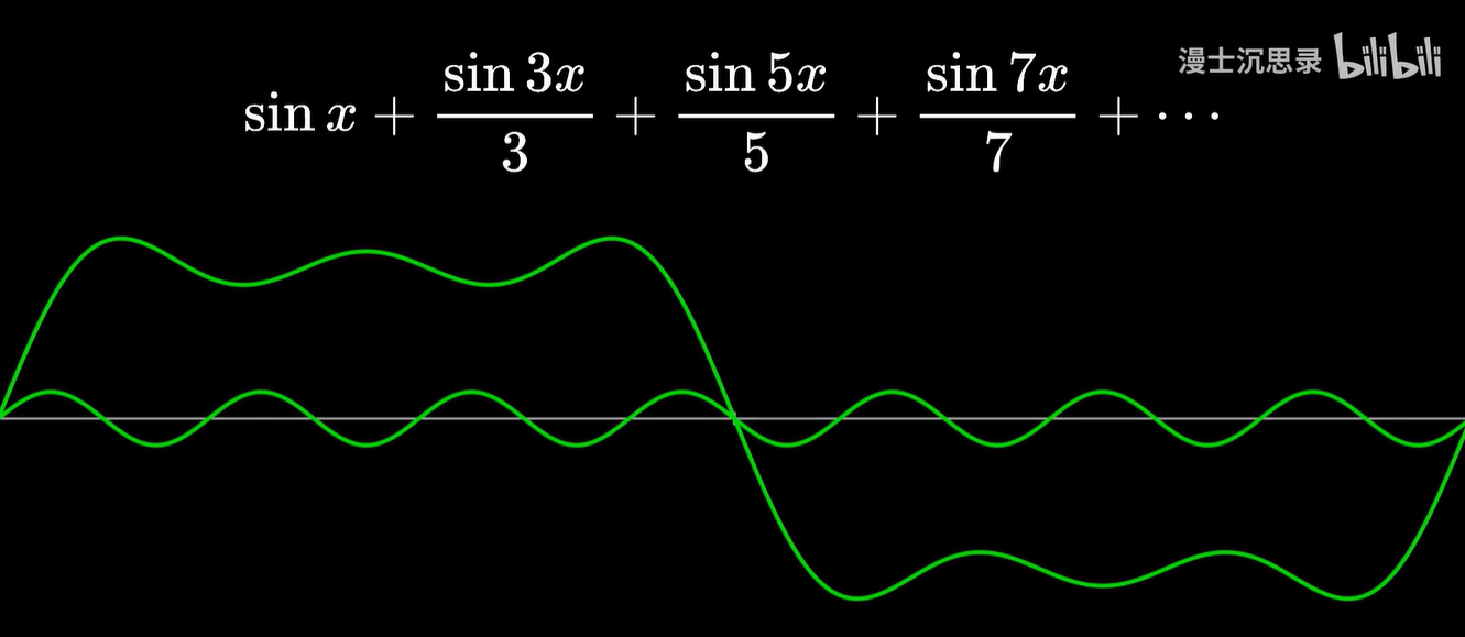 - 我们拥有了一个强大的周期函数的坐标系,它的基底是所有形如 sin nx 和 cos mx 的周期函数还有一个1,通过线性组合它们你可以表示出几乎所有周期为2π的函数。