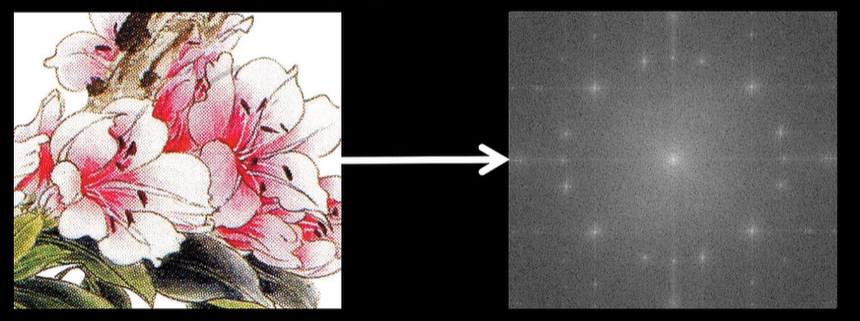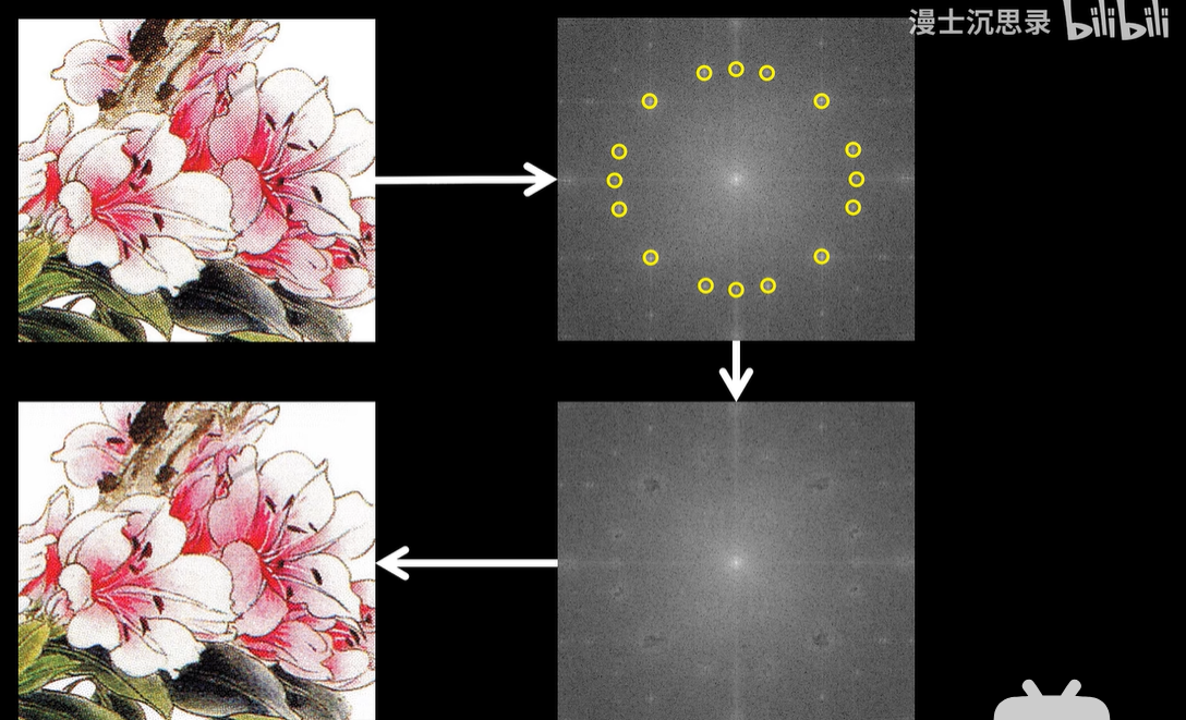 此时摩尔纹或者说网格纹的噪声会强烈激起某些特定频率和方向的基底的能量,我们只需要在频谱图中精准地抹掉这些频点,再将图像从频域逆变换回去,变回图片,令人头疼的这些条纹干扰便神奇地消失了,图像清晰了很多。