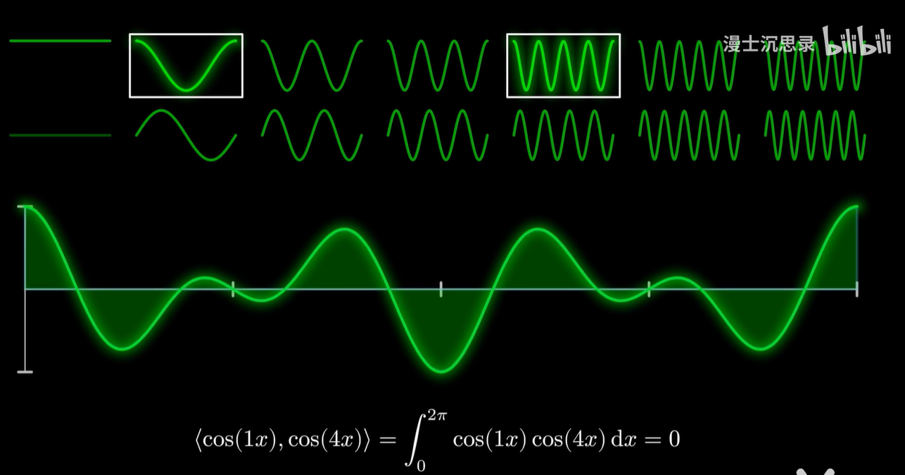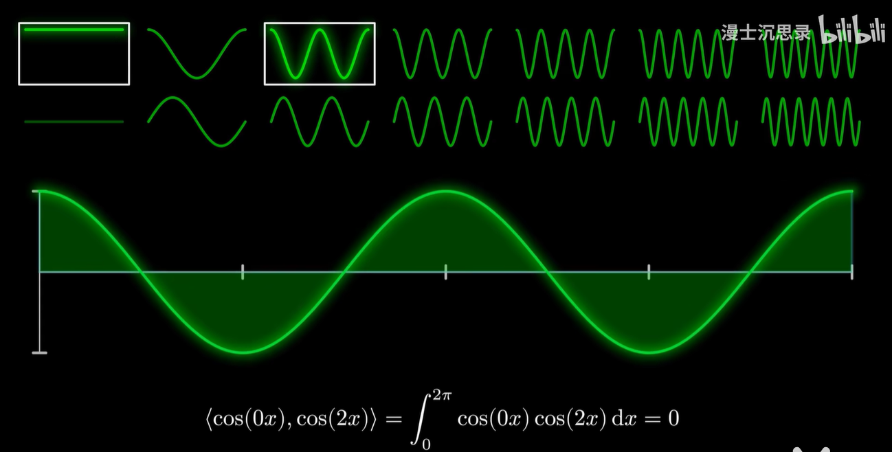 - 利用刚才定义的内积,这堆基底里啊,任意挑出两个正余弦函数,只要它们不是同一个,乘在一起,就可以积化和差,最后变成一个在0~2π区间内正负面积刚好相互抵消的函数。