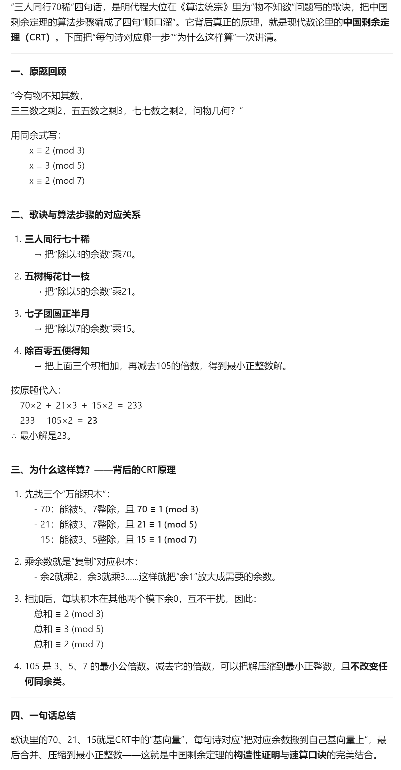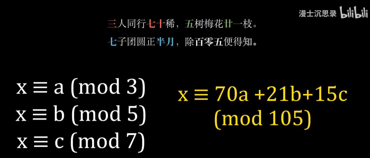 意思是:如果 X 除以3、5、7的余数分别是 A 、 B 、 C ,那么把 A 乘以70,加上 B 乘以21,再加上 C 乘以15,再对105除余数就是结果。