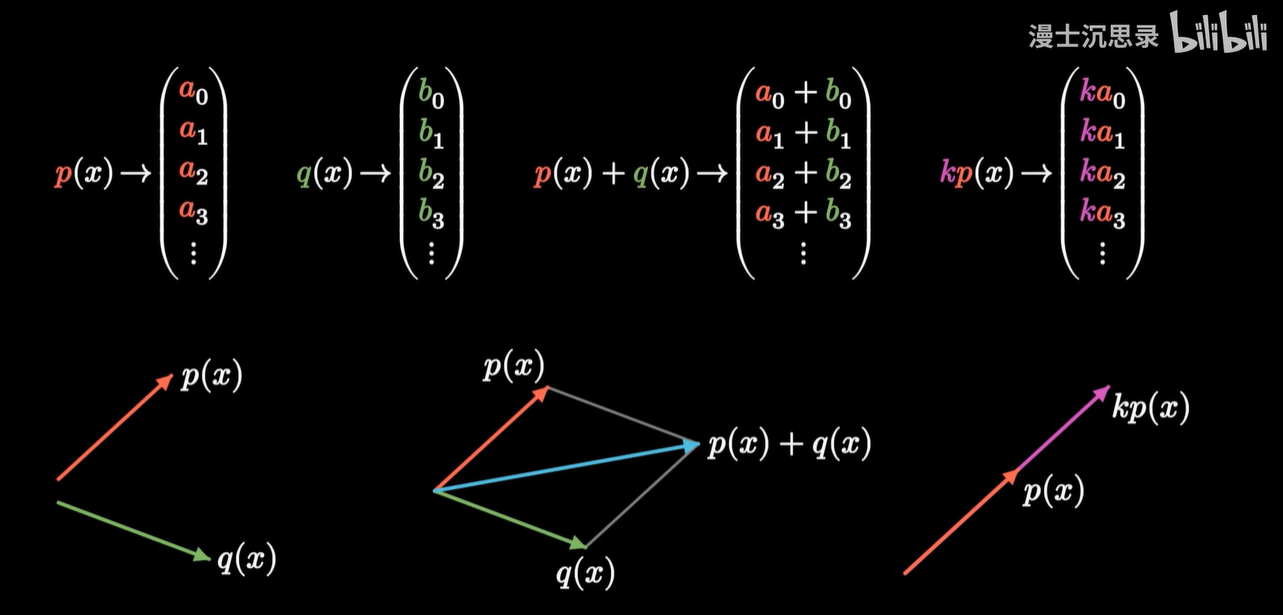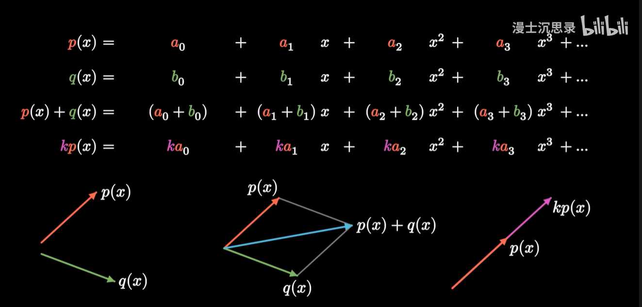 - 那么当我们从坐标翻译到向量时,本质上就是把每个单项式乘以坐标的各个系数,再加到一起,就还原了原本的多项式。
