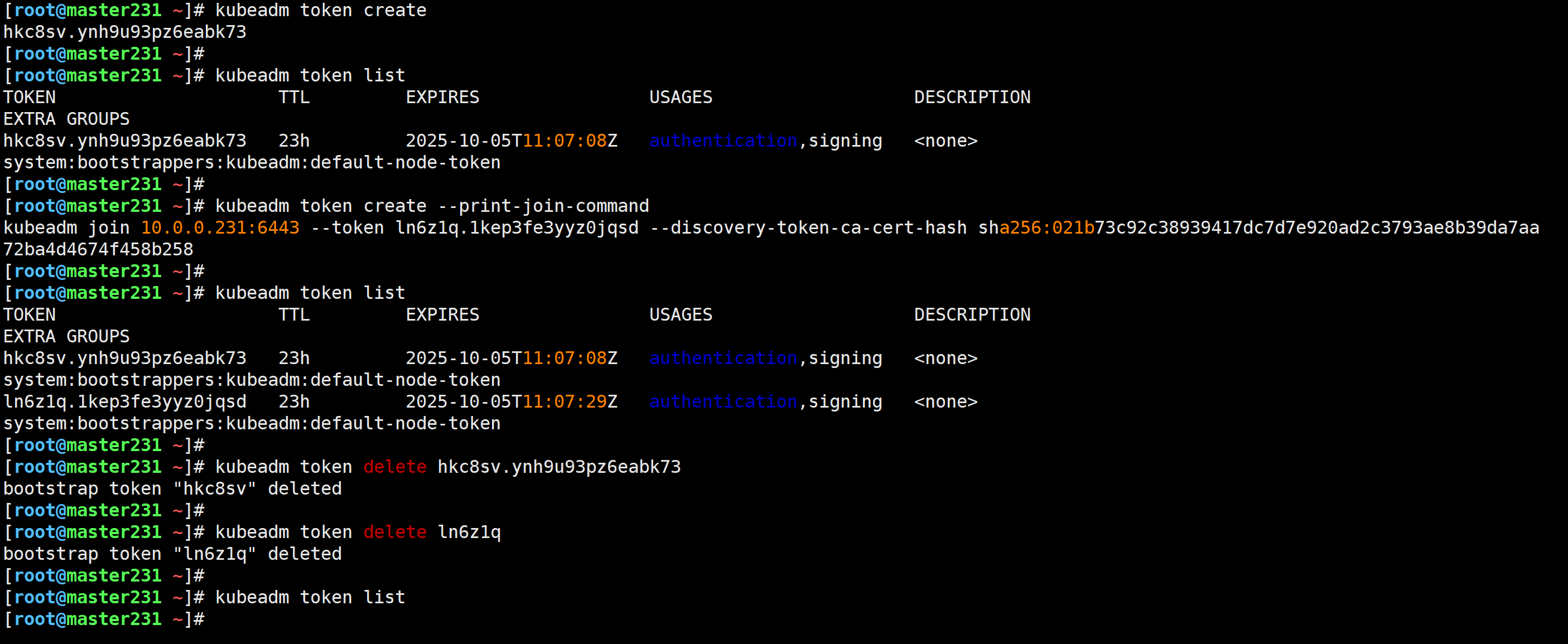kubeadm join 10.0.0.231:6443 --token ln6z1q.1kep3fe3yyz0jqsd --discovery-token-ca-cert-hash sha256:021b73c92c38939417dc7d7e920ad2c3793ae8b39da7aa72ba4d4674f458b258 4.删除token