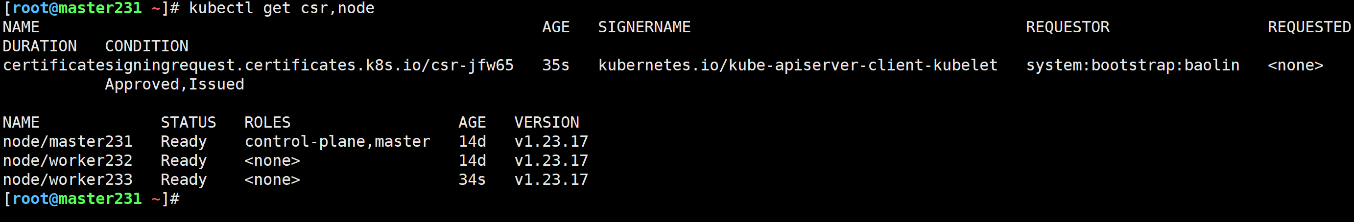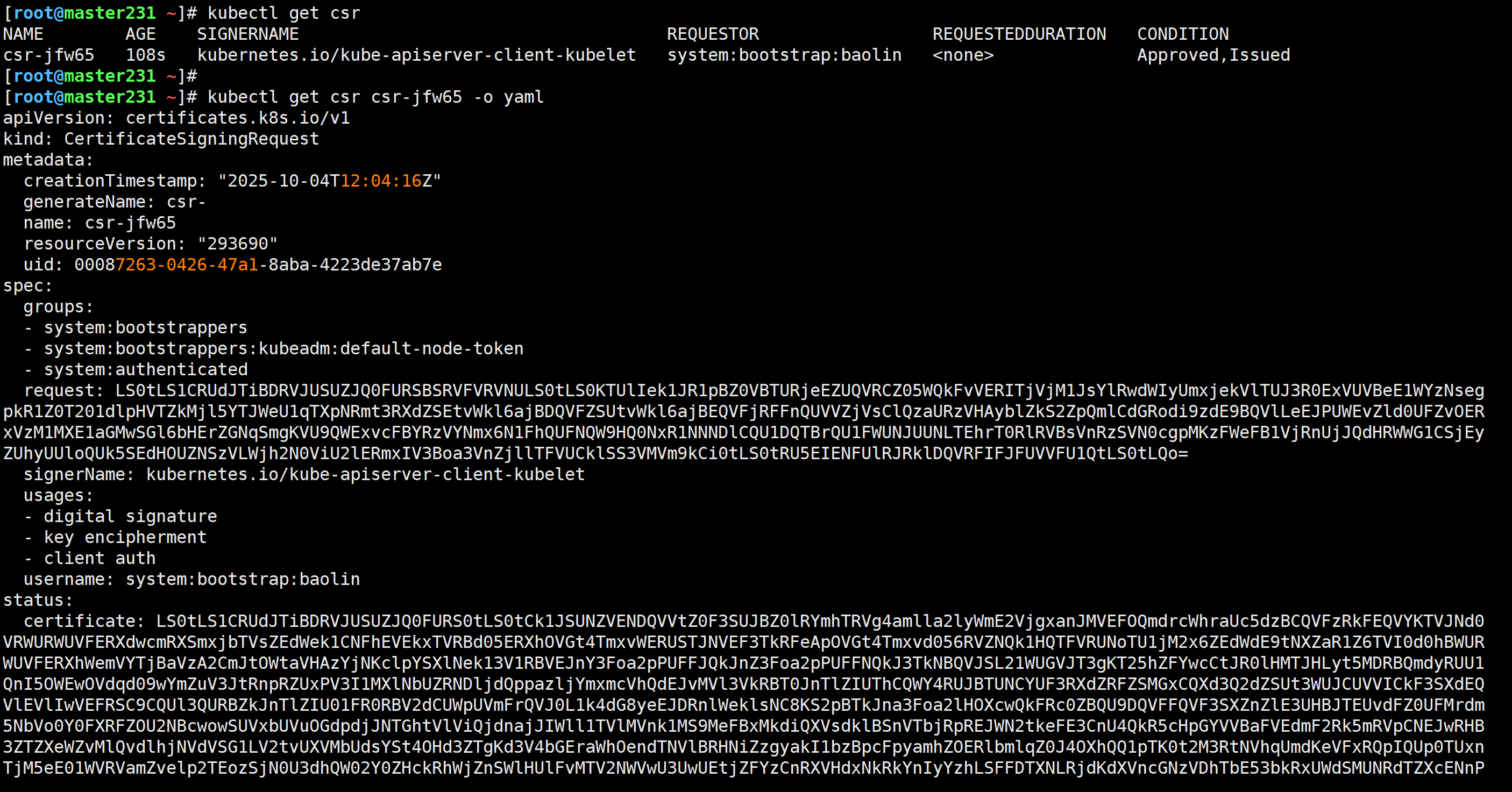 [root@master231 scheduler]# kubectl get csr[root@master231 scheduler]# kubectl get csr csr-54j4s -o yaml