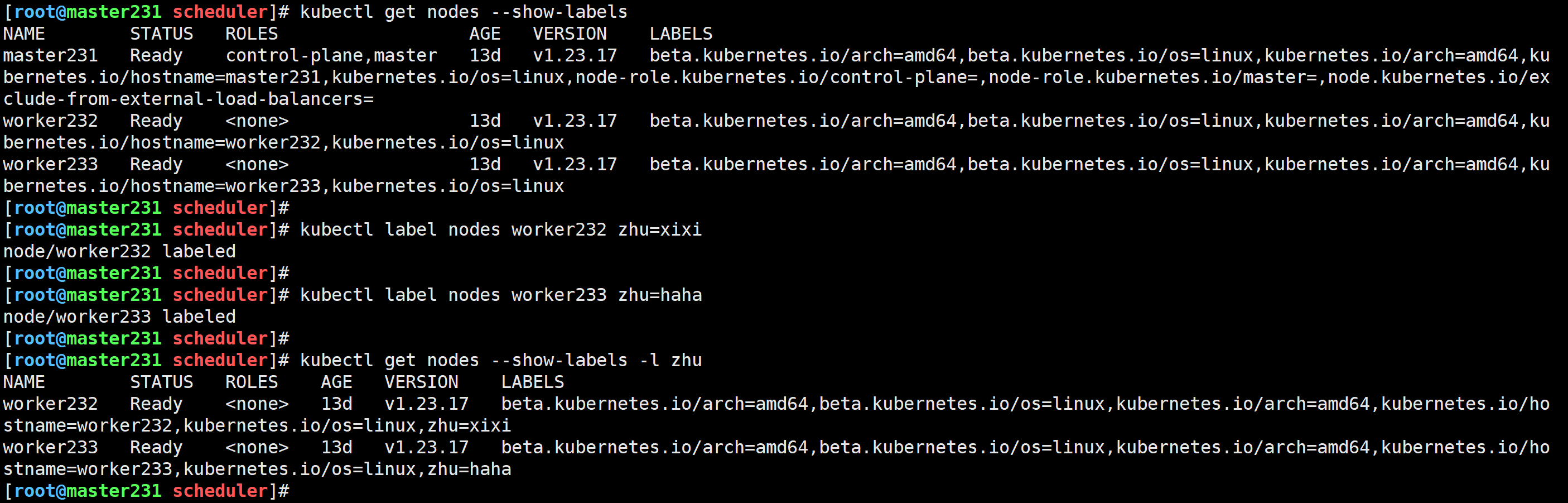 [root@master231 scheduler]# kubectl label nodes worker232 zhu=xixi