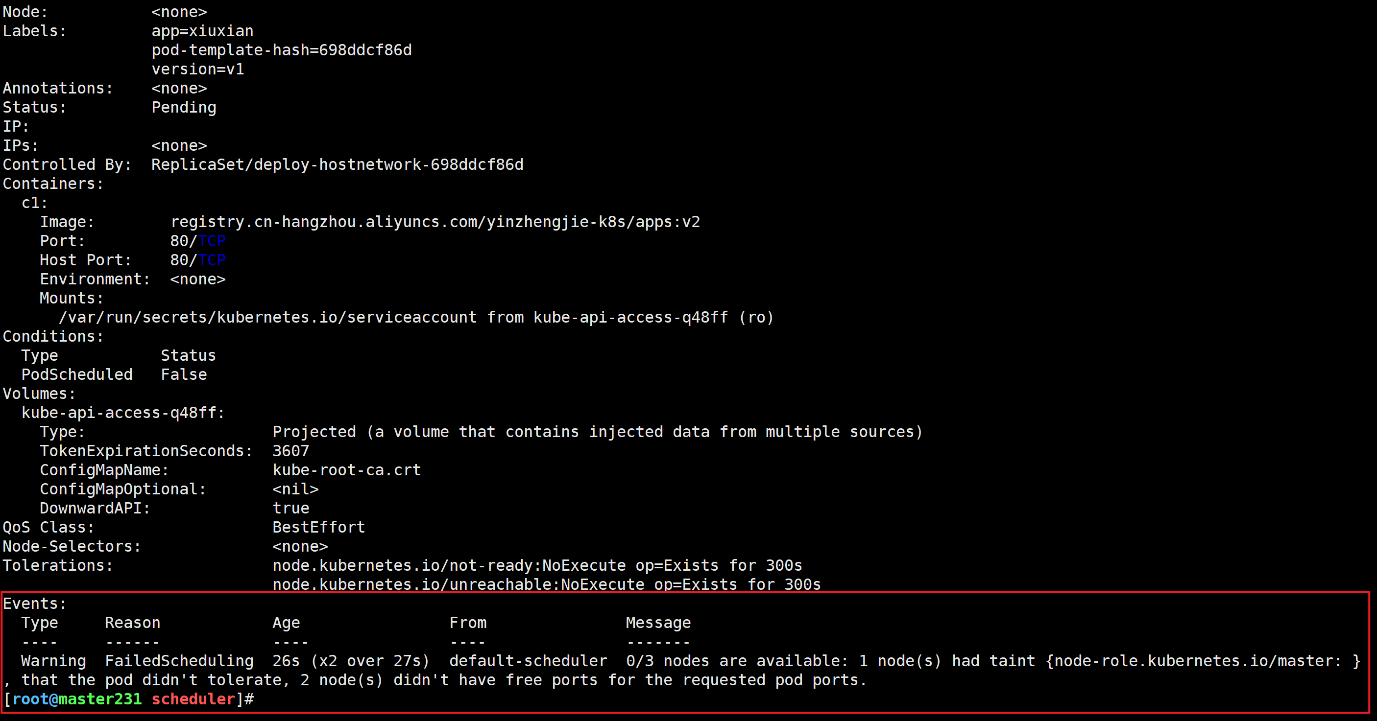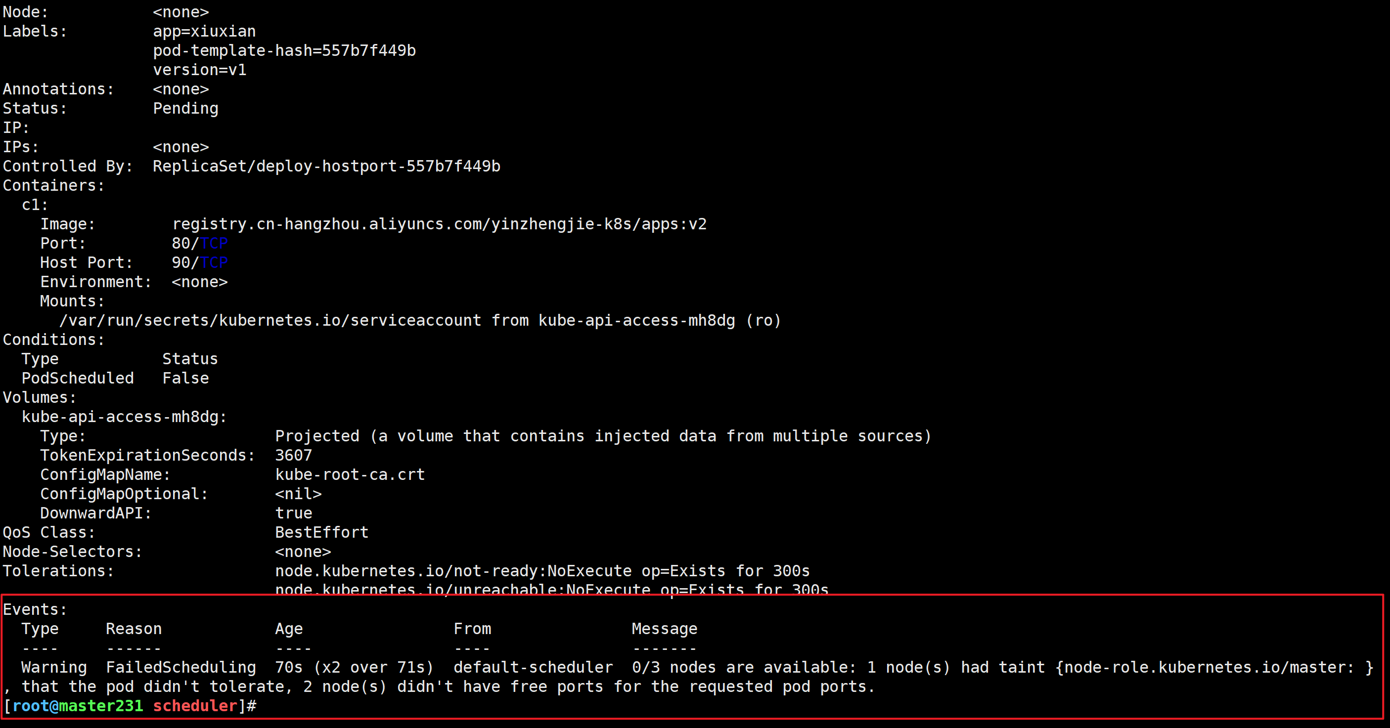 [root@master231 scheduler]# kubectl describe pod deploy-hostport-557b7f449b-wzw6wEvents:Type Reason Age From Message---- ------ ---- ---- -------Warning FailedScheduling 70s (x2 over 71s) default-scheduler 0/3 nodes are available: 1 node(s) had taint {node-role.kubernetes.io/master: }, that the pod didn't tolerate, 2 node(s) didn't have free ports for the requested pod ports.