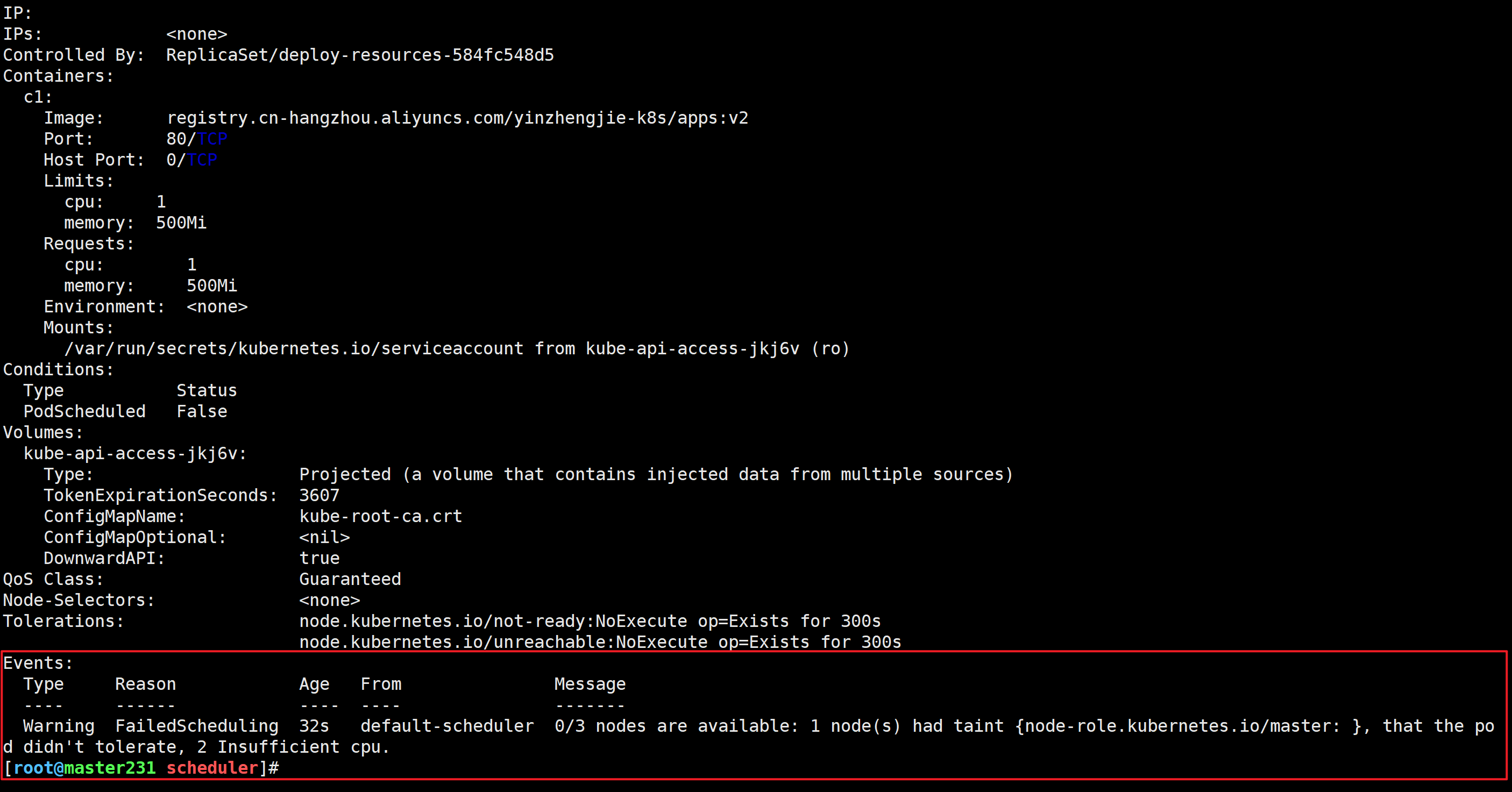 [root@master231 scheduler]# kubectl describe pod deploy-resources-584fc548d5-djrt4Events:Type Reason Age From Message---- ------ ---- ---- -------Warning FailedScheduling 32s default-scheduler 0/3 nodes are available: 1 node(s) had taint {node-role.kubernetes.io/master: }, that the pod didn't tolerate, 2 Insufficient cpu.
