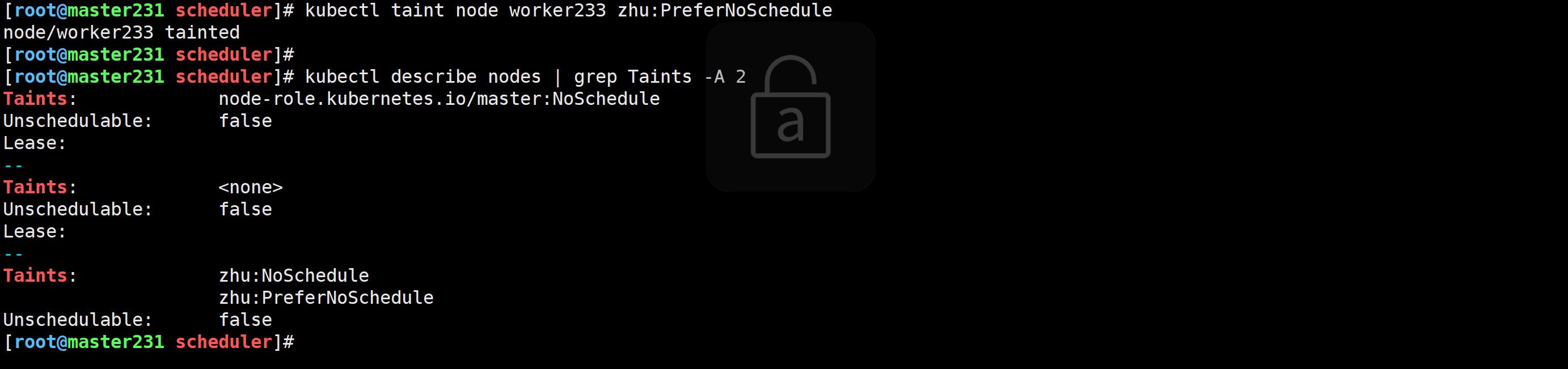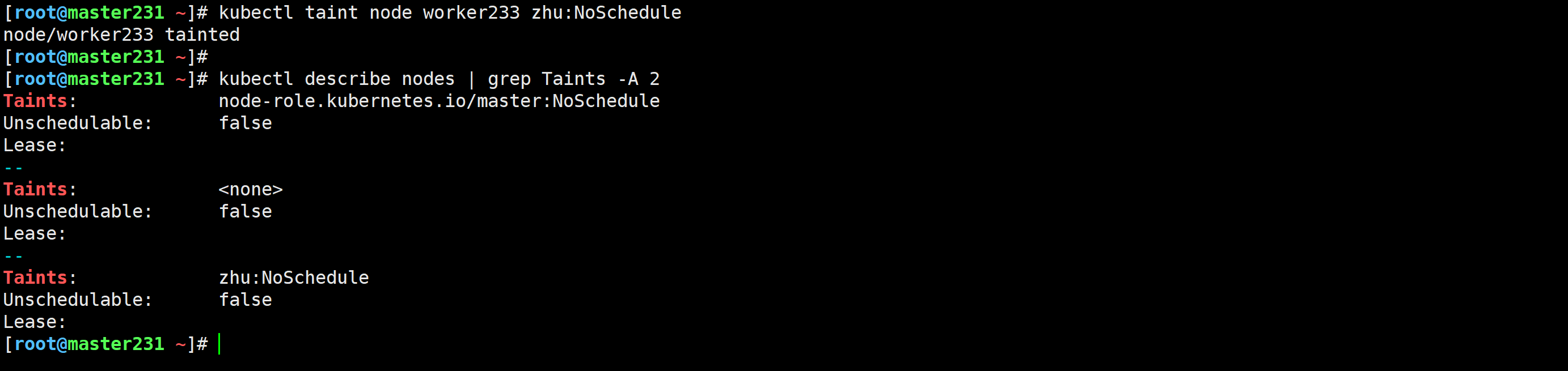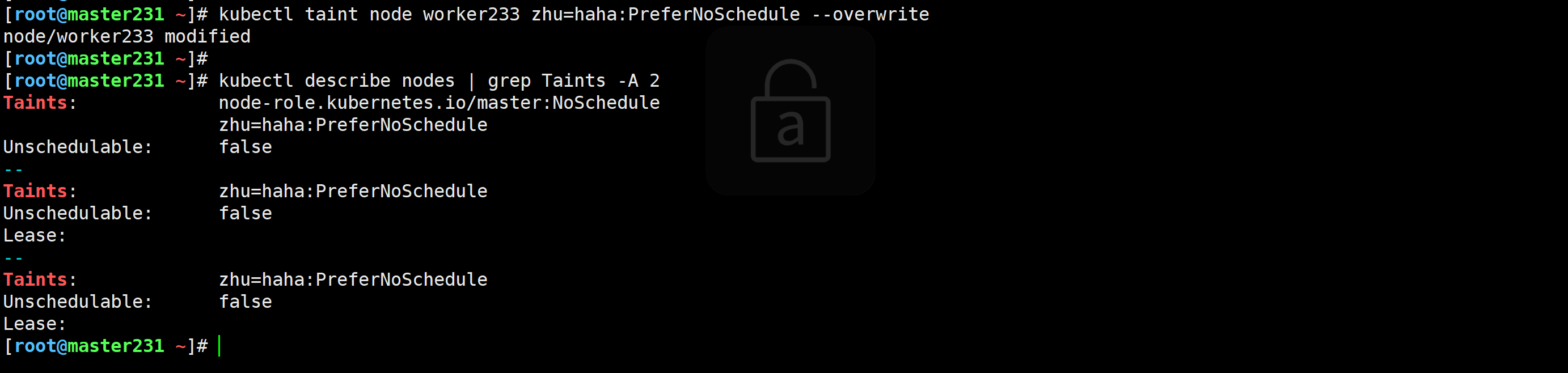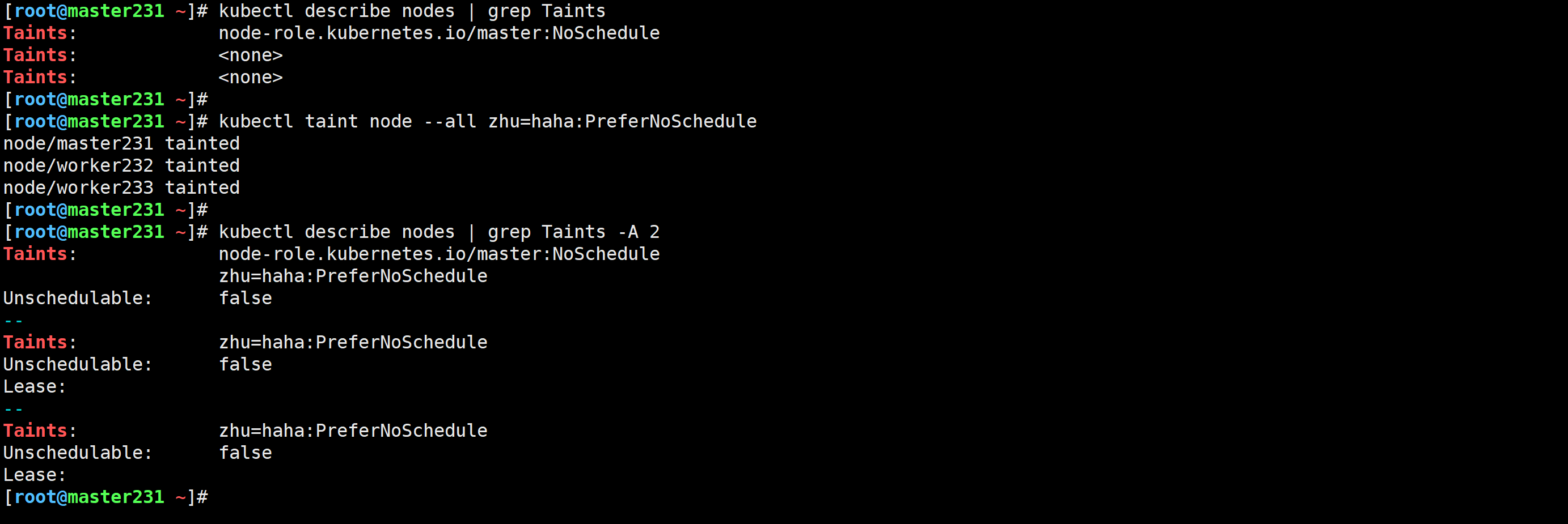 [root@master231 ~]# kubectl taint node worker233 zhu=haha:PreferNoSchedule --overwrite