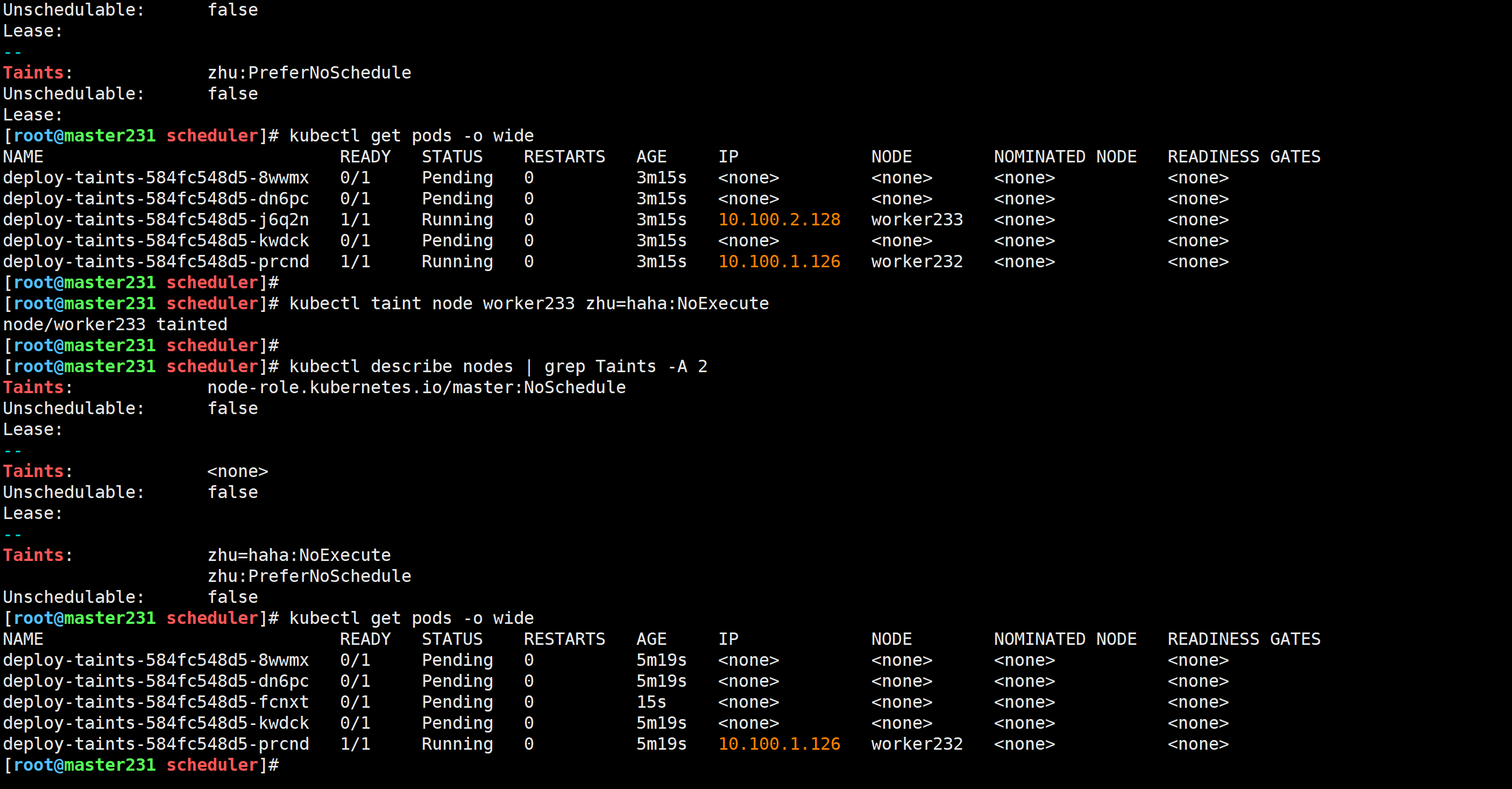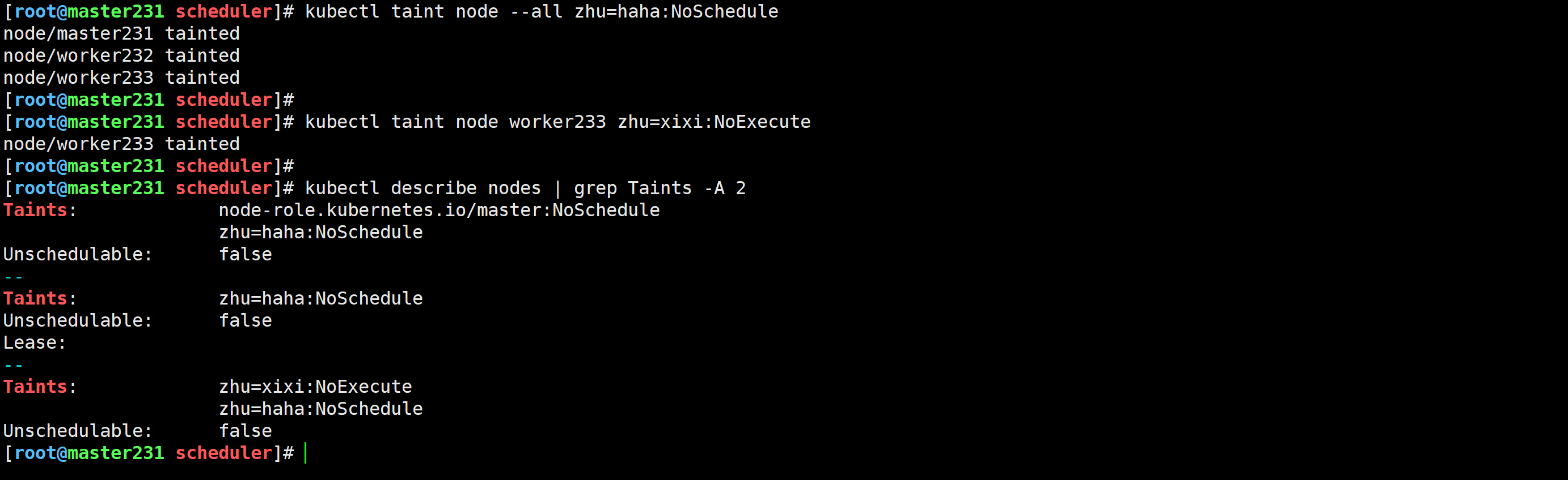 [root@master231 scheduler]# kubectl taint node worker233 zhu=haha:NoExecute
