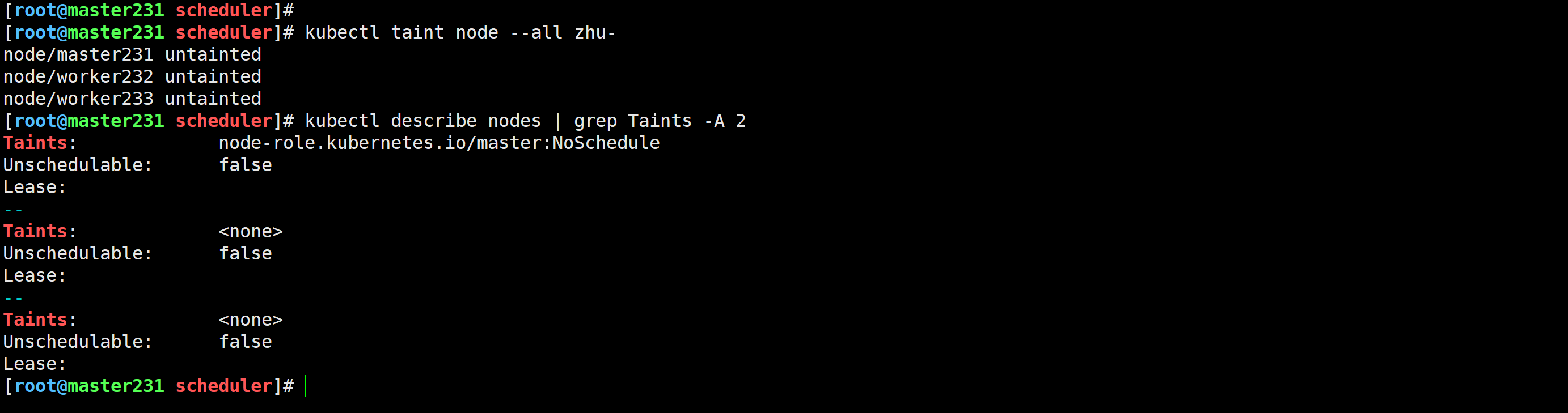 [root@master231 scheduler]# kubectl describe nodes | grep Taints -A 2