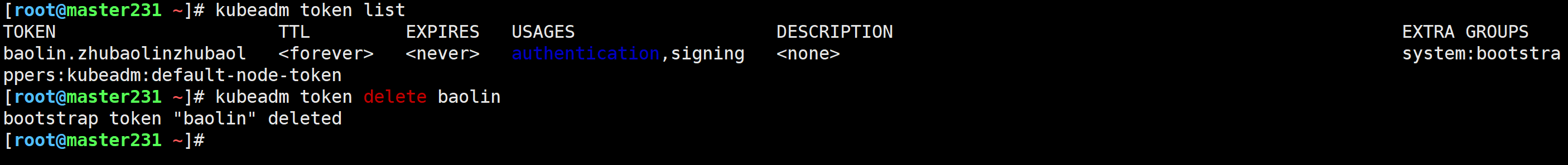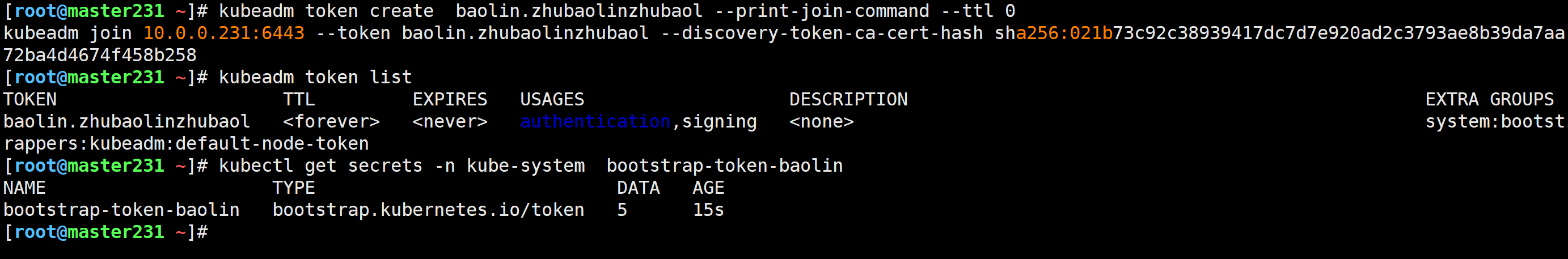 [root@master231 ~]# kubeadm token create baolin.zhubaolinzhubaol --print-join-command --ttl 0