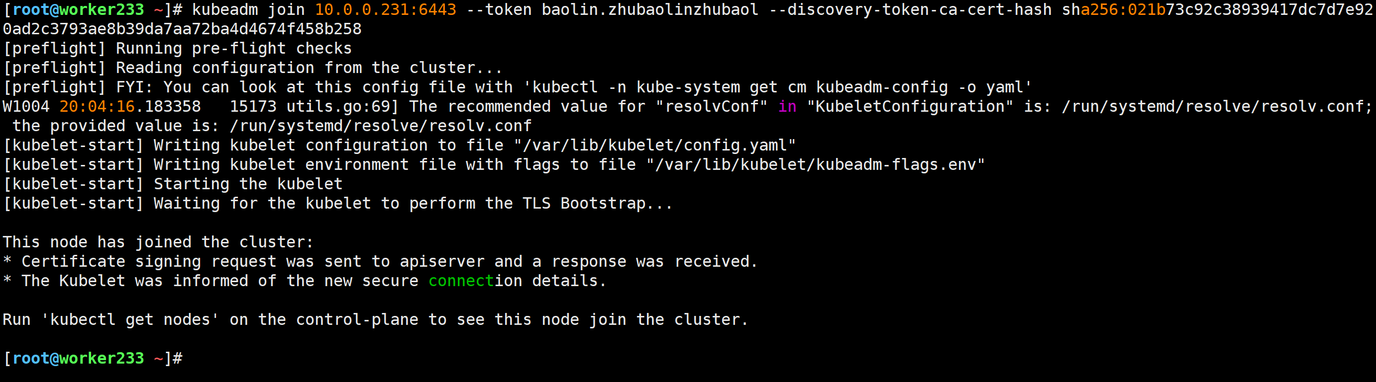 [root@worker233 ~]# kubeadm join 10.0.0.231:6443 --token baolin.zhubaolinzhubaol --discovery-token-ca-cert-hash sha256:021b73c92c38939417dc7d7e920ad2c3793ae8b39da7aa72ba4d4674f458b258