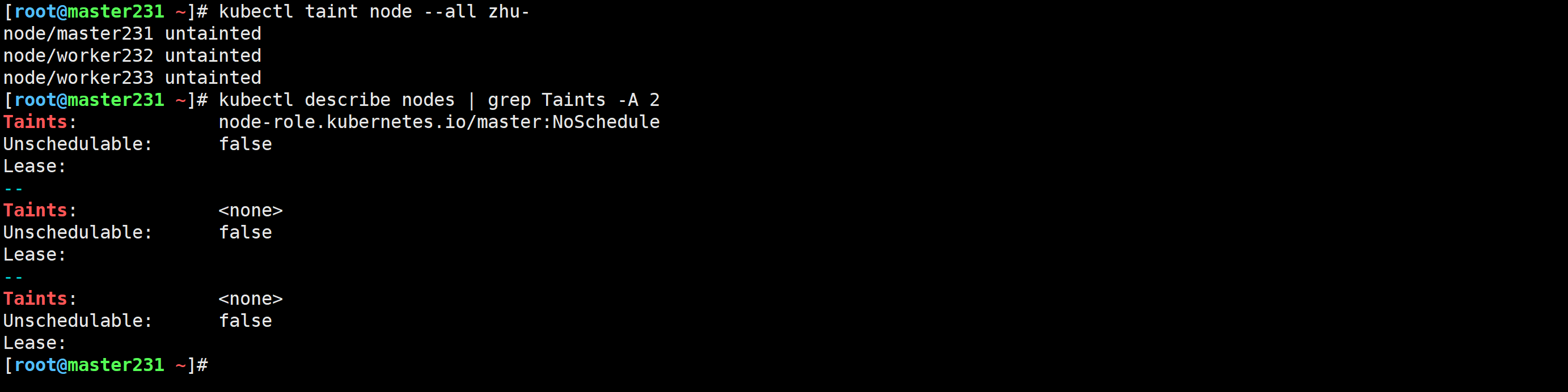 [root@master231 ~]# kubectl describe nodes | grep Taints