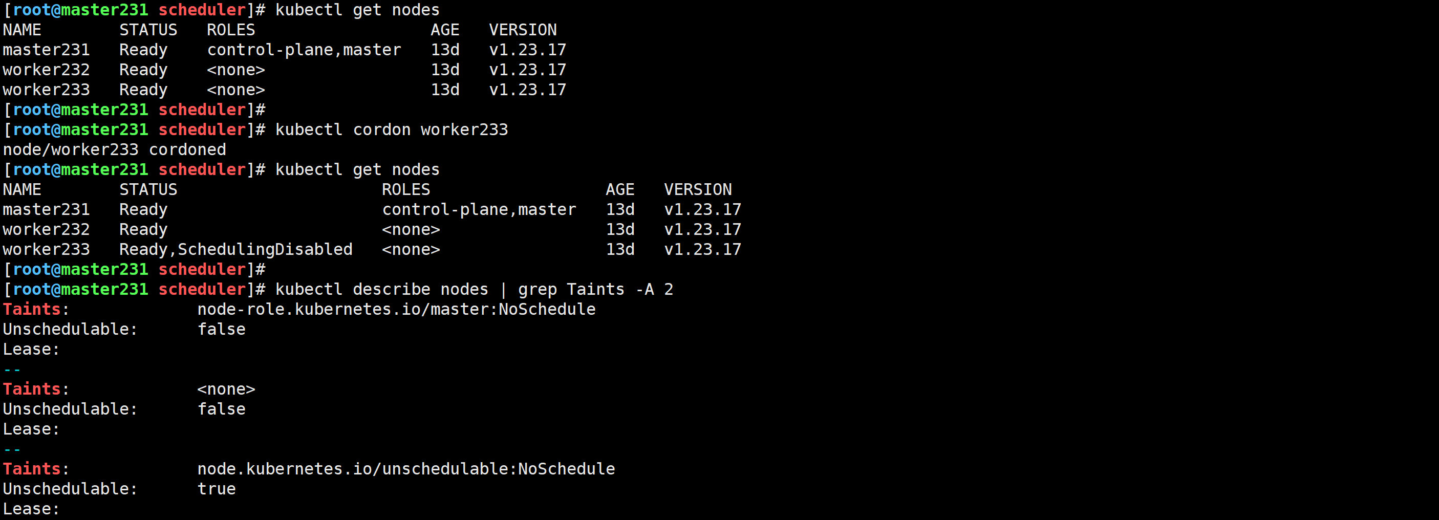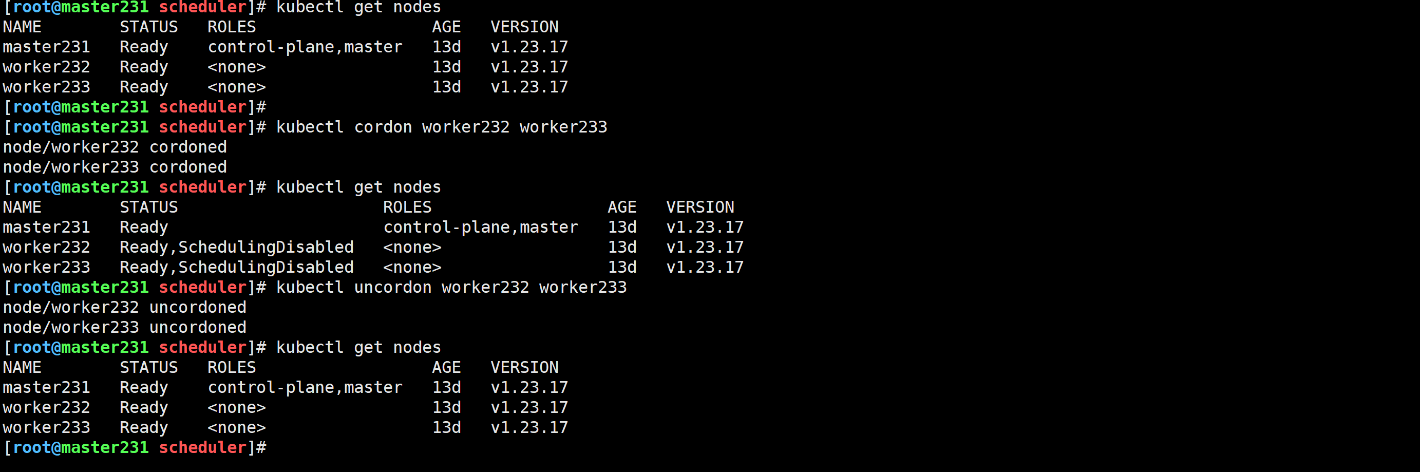 [root@master231 scheduler]# kubectl cordon worker232 worker233