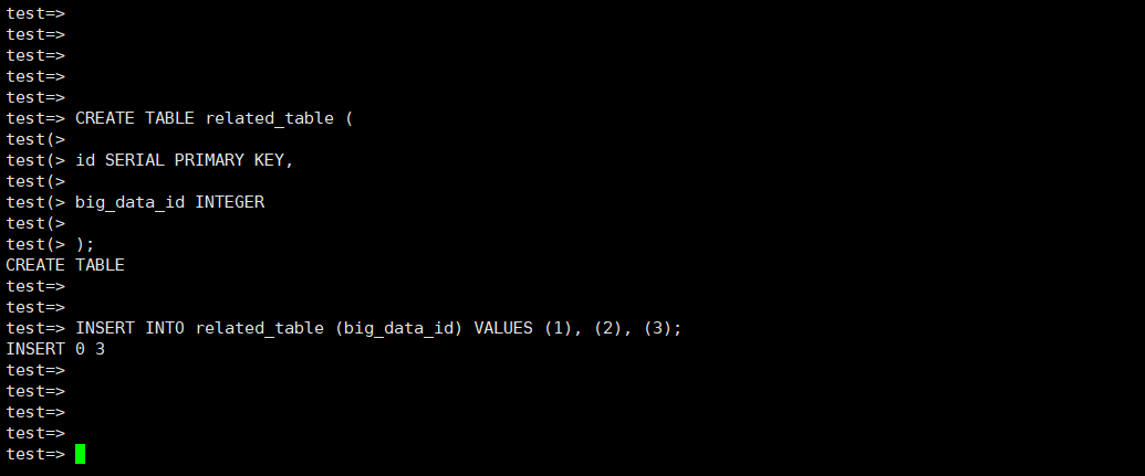 CREATE TABLE related_table (id SERIAL PRIMARY KEY,big_data_id INTEGER);INSERT INTO related_table (big_data_id) VALUES (1), (2), (3);