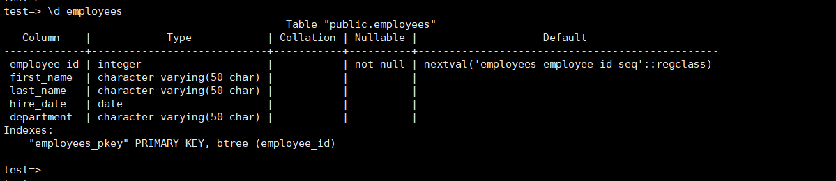 -------------+----------------------------+-----------+----------+------------------------------------------------employee_id | integer | | not null | nextval('employees_employee_id_seq'::regclass)first_name | character varying(50 char) | | | last_name | character varying(50 char) | | | hire_date | date | | | department | character varying(50 char) | | |