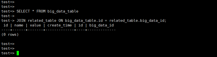 执行多表连接查询,例如查询related_table中关联的big_data_table的记录,执行以下 SQL 语句: