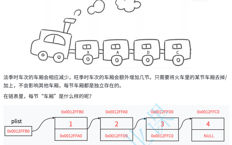 与顺序表不同的是,链表里的每节“车厢”都是独立申请下来的空间,我们称之为:结点。图中指针变量plist保存的是第一个结点的地址,我们称plist此时“指向”第一个结点,如果我们希望plist指向第二个结点时,只需要修改plist保存的内容为0x0012FFA0。