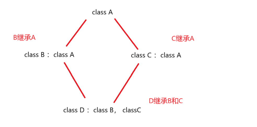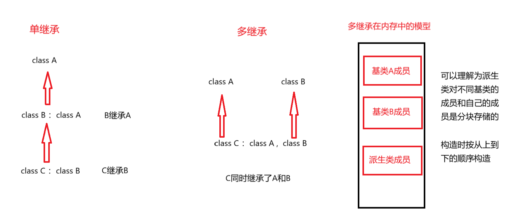 多继承:一个派生类有两个或以上直接基类时称这个继承关系为多继承,多个基类之间用逗号分隔,多继承对象在内存中的模型是,先继承的基类在前面,后面继承的基类在后面,派生类成员在放到最后。