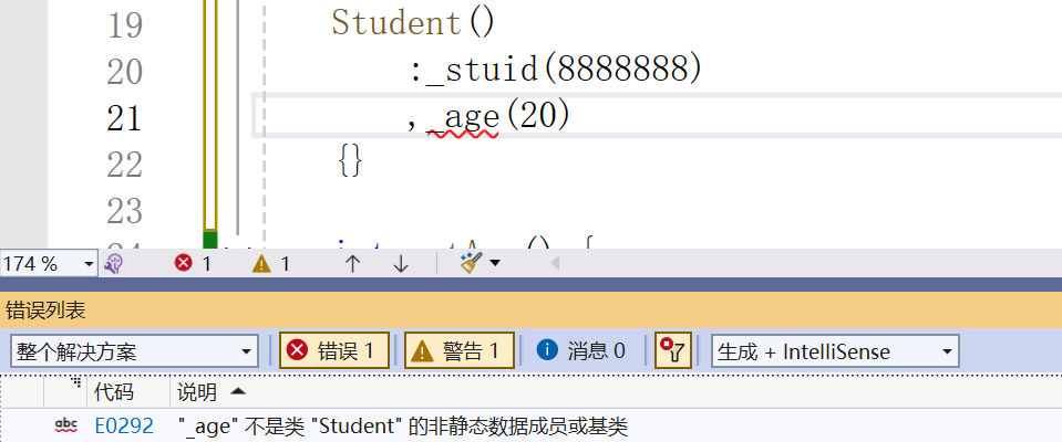 可以看到Student类中对_stuid初始化却不能对_age初始化。
