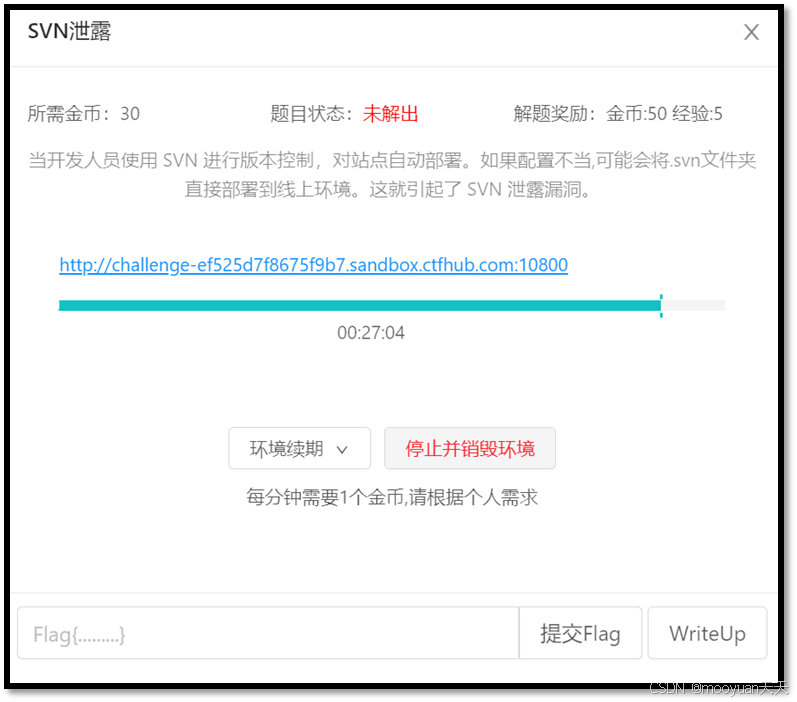 打开关卡如下所示,提示信息为“当开发人员使用 SVN 进行版本控制,对站点自动部署。如果配置不当,可能会将.svn文件夹直接部署到线上环境。这就引起了 SVN 泄露。”,提示本关卡可以利用SVN泄露进行渗透测试。点击打开题目,此时系统自动创建Docker环境,下图蓝色部分的URL地址就是靶场环境。