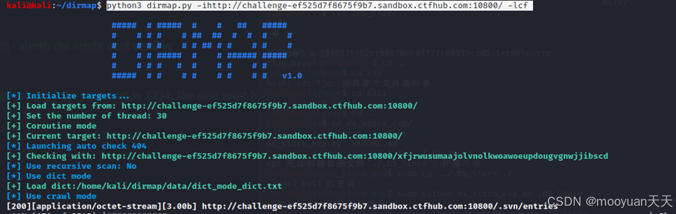 通过目录扫描工具对challenge-ef525d7f8675f9b7.sandbox.ctfhub.com:10800进行渗透,这里选择使用dirmap工具进行渗透,命令如下所示。