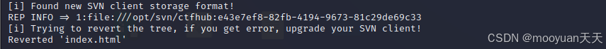 目录进行了 SVN 泄露利用:工具检测到目标使用了新的 SVN 客户端存储格式,识别出版本库信息(路径 file:///opt/svn/ctfhub