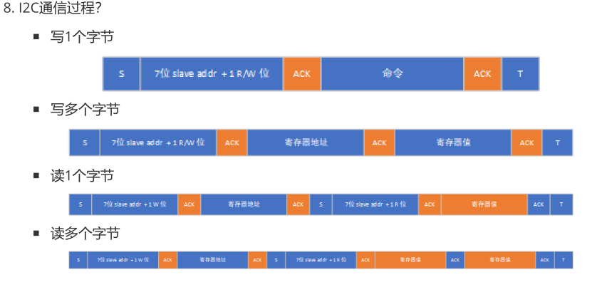 - 起始信号:SCL为高电平时,SDA由高电平跳变为低电平。