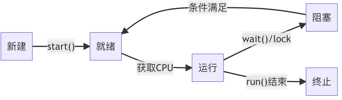 运行 | 正在执行run()方法 | → 阻塞(等待I/O/锁等)或 → 终止 |